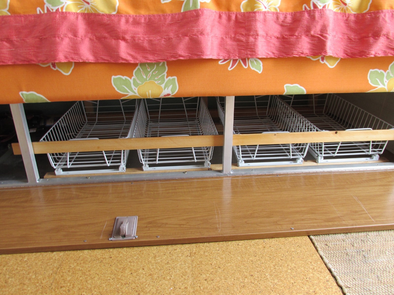 FABRICATED, USING THE DOOR AND FRAMEWORK FROM THE GAUCHO, SUPPORT FOR THE BED AND A SLIDE OUT 4 DRAWER PANTRY UNDER THE BED.