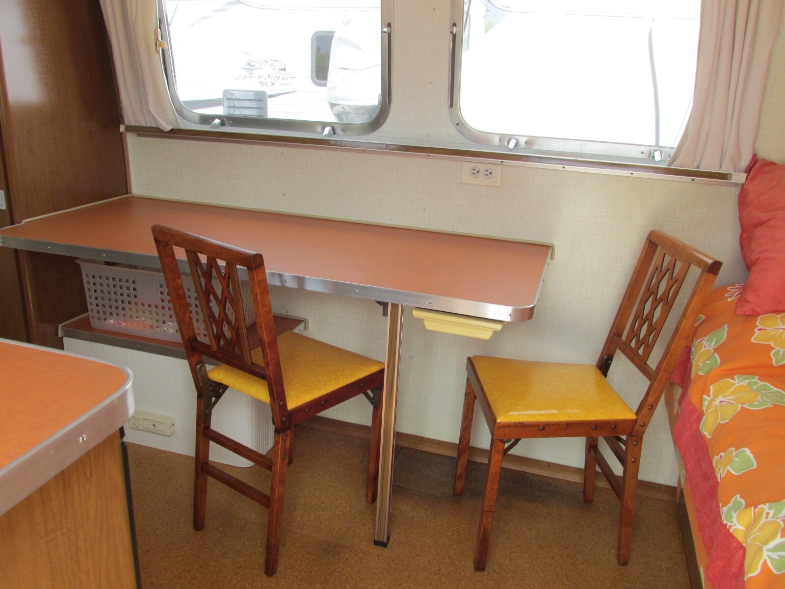 REMOVED CURB SIDE GAUCHO AND FABRICATED A MARMOLEUM COUNTERTOP DINETTE WITH TWO VINTAGE FOLDING LEG O MATIC CHAIRS.