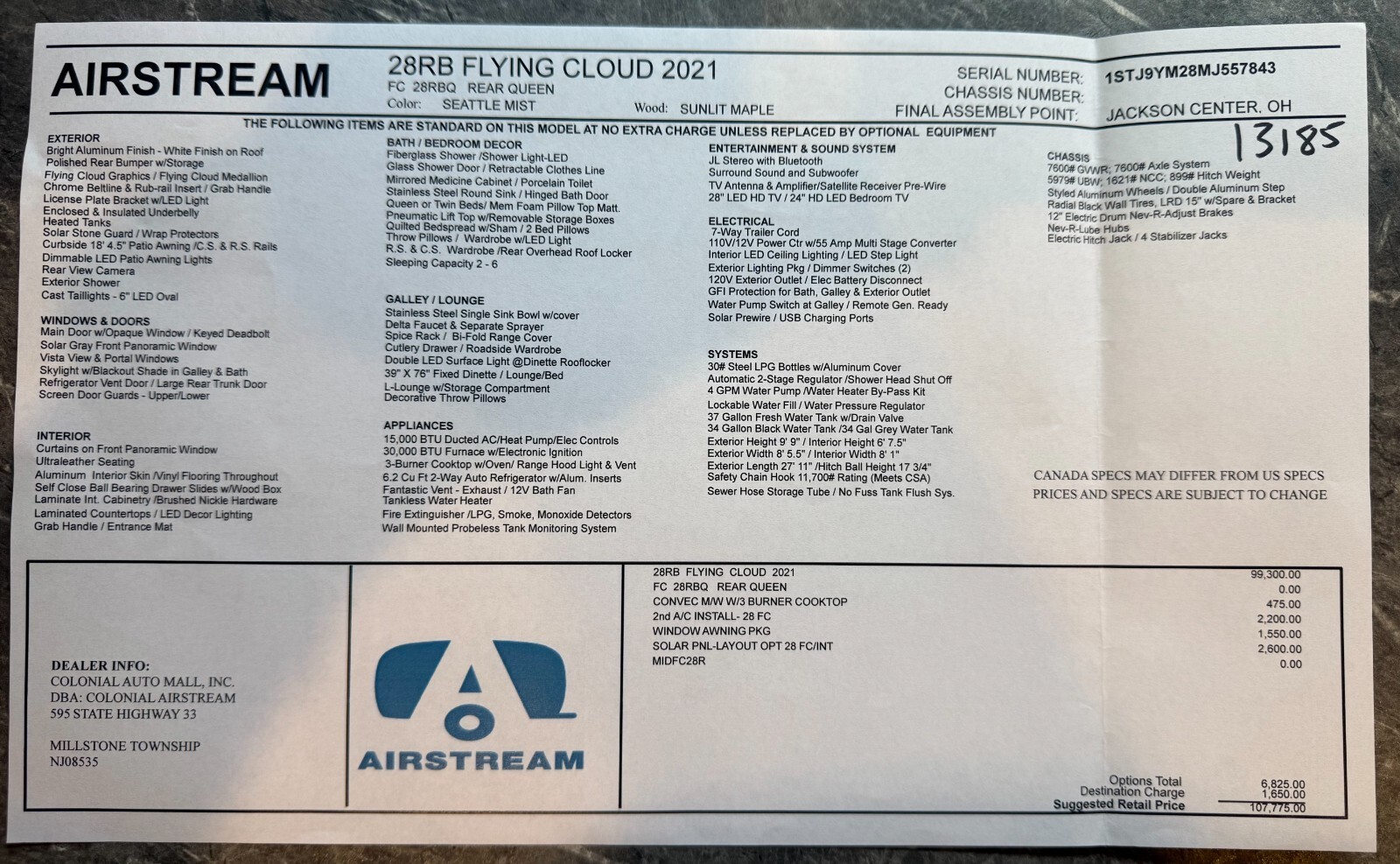 Original owner purchased new from Colonial Airstream of NJ, covered year round storage, annually walbernized, fresh tank disinfected and sanitized multiple times a year, exterior meticulously washed and maintained, interior is like new, clean title. Everything works as intended and it just passed PA state inspection in May of 2025. I have all of the original paperwork to include the title in hand. Tried to list the important stuff below but needless to say you won t need to buy much else in order to get out camping day 1! Pictures will tell the story but please reach out if there are any questions!