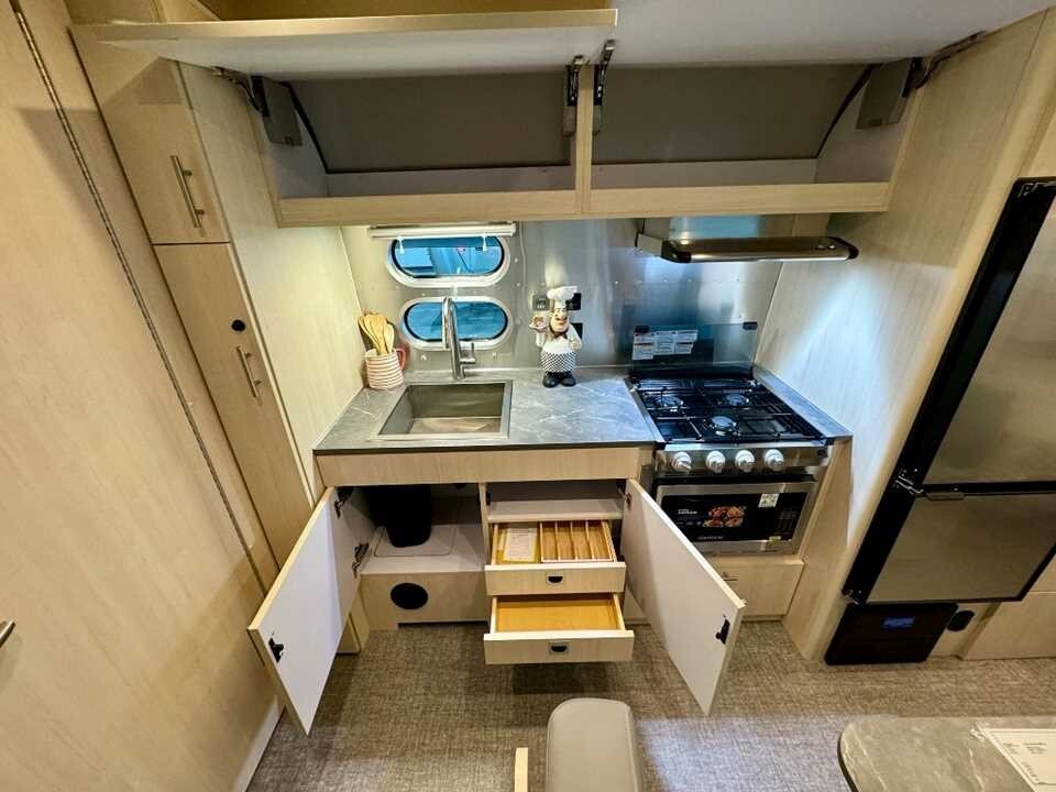 THE FOLLOWING ITEMS ARE STANDARD ON THIS MODEL AT NO EXTRA CHARGE UNLESS REPLACED BY OPTIONAL EQUIPMENTEXTERIORBright Aluminum Finish – White Finish on RoofPolished Rear Bumper w/StorageFlying Cloud MedallionChrome Beltline Rubrail Inserts / Grab HandleLicense Plate Bracket w/LED LightEnclosed Insulated UnderbellyCurbside 14' 2" Patio Awning C.S. R.S. RailsSolar Front
