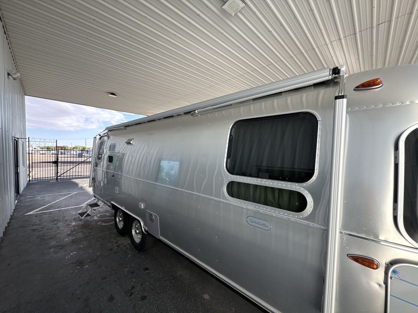 The 2025 Airstream Globetrotter 27FB Queen is a beautifully designed travel trailer that blends classic Airstream style with modern amenities. Its sleek aluminum exterior is both eye-catching and aerodynamic, enhancing fuel efficiency during travel.Inside, the 27FB Queen offers a spacious and thoughtfully arranged interior. The front features a comfortable queen-size bed with an AdaptaFlex memory foam mattress, flanked by nightstands and illuminated by panoramic windows that fill the space with natural light. For privacy, blackout curtains are easily accessible.The living area includes an L-shaped lounge with plush seating that can convert into additional sleeping space, accommodating up to six people. The dinette is perfect for meals or as a workspace, with strategically placed USB and 110V outlets to keep devices charged.The kitchen is equipped with high-end appliances, including a three-burner stainless steel