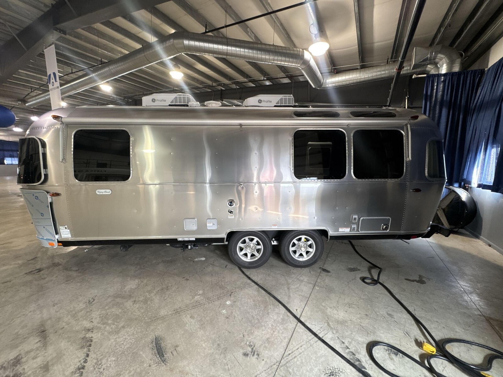 The 2024 Airstream Flying Cloud 25FB Queen is a standout travel trailer that combines classic design with modern amenities, offering a comfortable and stylish experience for travelers. Its iconic silver aluminum exterior not only turns heads but also ensures durability for years to come.Inside, the 25FB Queen features a thoughtfully designed layout that maximizes both space and comfort. At the front, a cozy queen bed is surrounded by panoramic windows, filling the space with natural light and providing scenic views. Ample storage options, including overhead cabinets and under-bed compartments, help keep belongings organized.The living area is perfect for relaxation and socializing. A convertible dinette comfortably seats four for meals and can be transformed into an additional sleeping area when needed. Adjacent to the dinette, a plush lounge offers a great spot to unwind, watch TV, or enjoy a good book.The kitchen is equipped