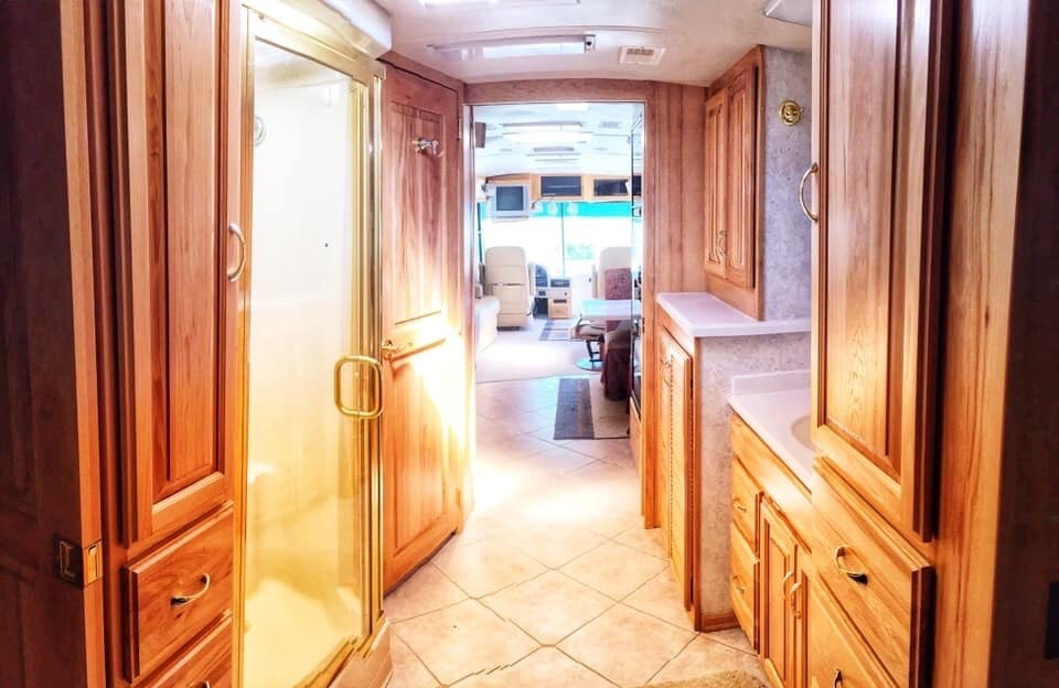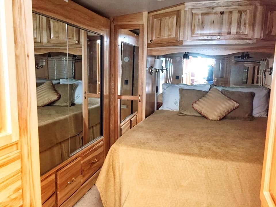 The expansive wardrobe, washer/dryer, and ample storage throughout the cabin and exterior basement—with pullout trays—cater to all the belongings that come with RV living.