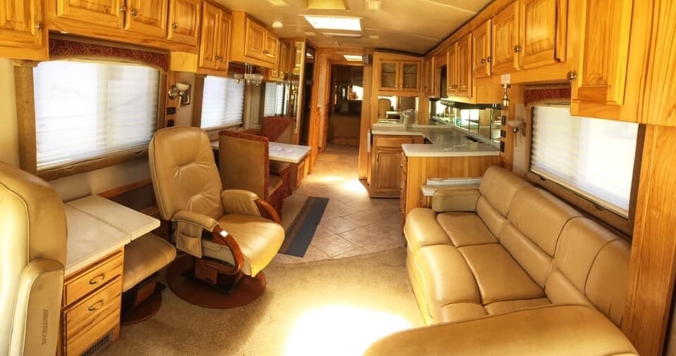 Pantry (Included), Refrigerator/freezer (Included), Microwave/convection oven (Included), Stove (Included), Interior Lighting (Included), Satellite Dish (Included; DISH or DirecTV), Stereo System (Included), Flatscreen TVs (2 included), Wi-Fi router (Included), Air Conditioning (Included), Bathroom Sink (Included), Bed - Queen (New; included), Black Water Flush System (Included), Carpet (Included); ceramic tile in kitchen and bathroom (Included)