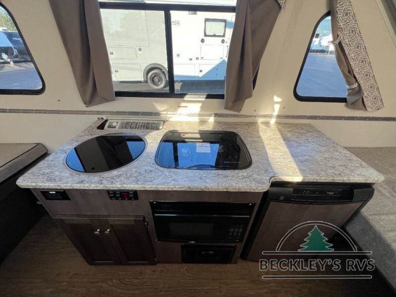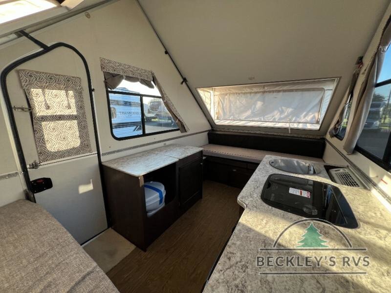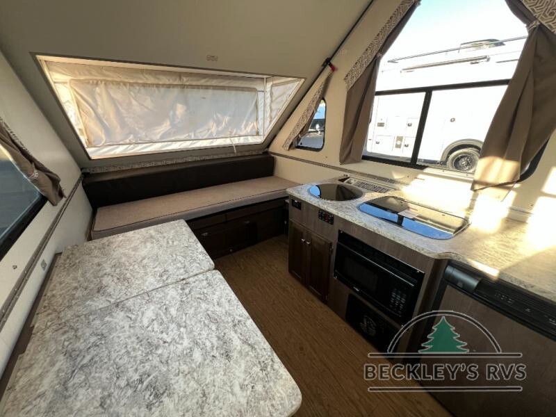 One side of the camper has a sink, two burner range, and an under counter refrigerator. In the front, you will find a dinette which makes into a bed.