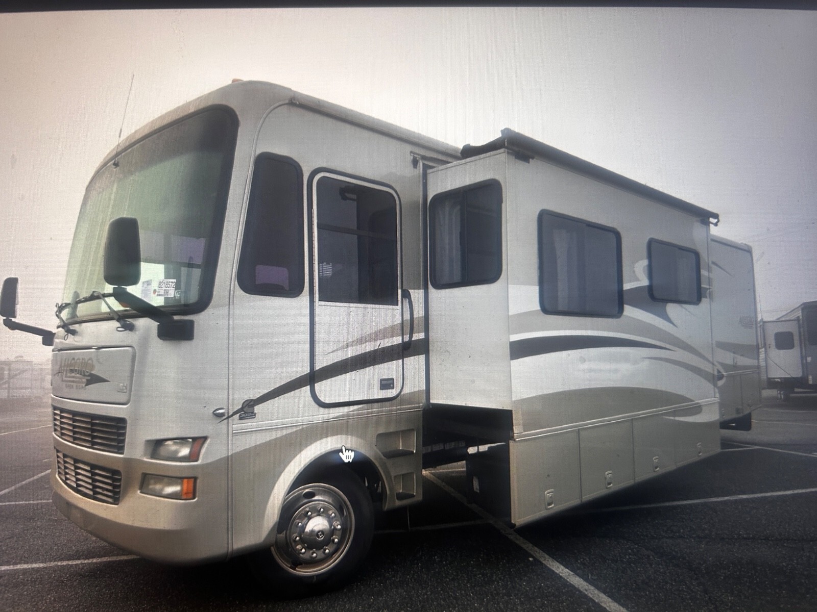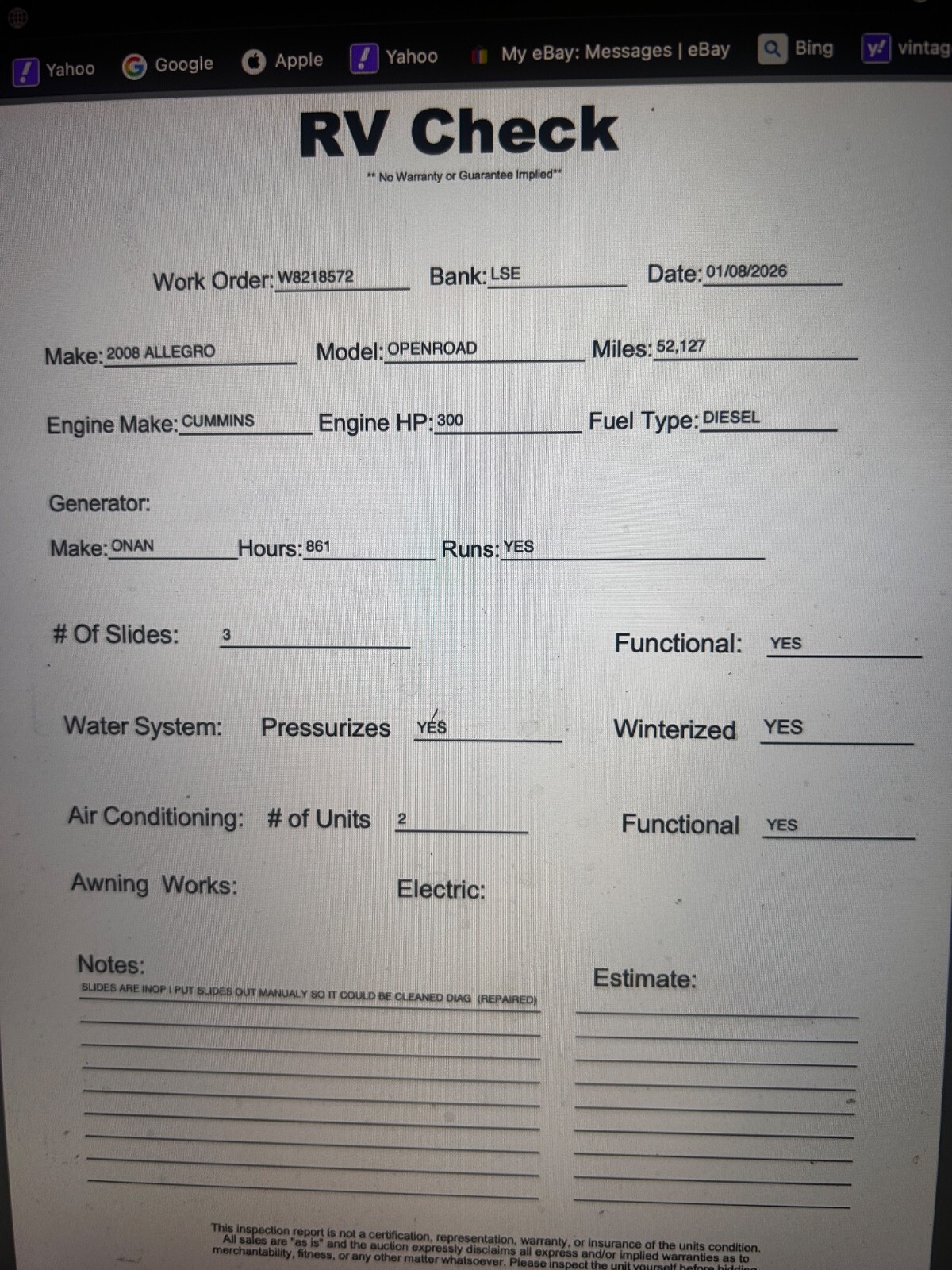 PLEASE DON'T BID IF YOU DON'T HAVE MONY,,,PLEASE READ DESCRIPTION VERY CAREFUL BEFORE YOU BIDS,,,,2008 Allegro cummins diesel with 52500 k miles,,,,three slide runs good , ,,,, bank name on the title with reassignment to a new buyer from a dealer we sell bank repo very cheap. diesel generato, you can inspect the unit anytime you want .call for appointment,,,deposit non refundable sold as i, , please do not bids if you don’t have the money and if you have less than 10 feedback contact us because we will have the right to reject your bid if you are the winner and you don’t complete the sale we’re gonna hold you responsible and we’re gonna report you to eBay,,, OR 845-798-0456 SOL