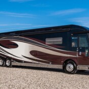 If you are looking for a motor home with a bath and a half, and lots of space, then you have found it in the 45T American Heritage by American Coach. Stepping inside, you will find a slide with a leather sofa, dining table & chairs, and dinette base with desk. The opposite side has a wall slide with a leather sofa with air mattress, double kitchen sink, two burner range, residential refrigerator with ice maker, pantry, two wardrobes, a 46" LED tv, and dresser. In the front of the motor home, there are two 46" LED tv's for your enjoyment.