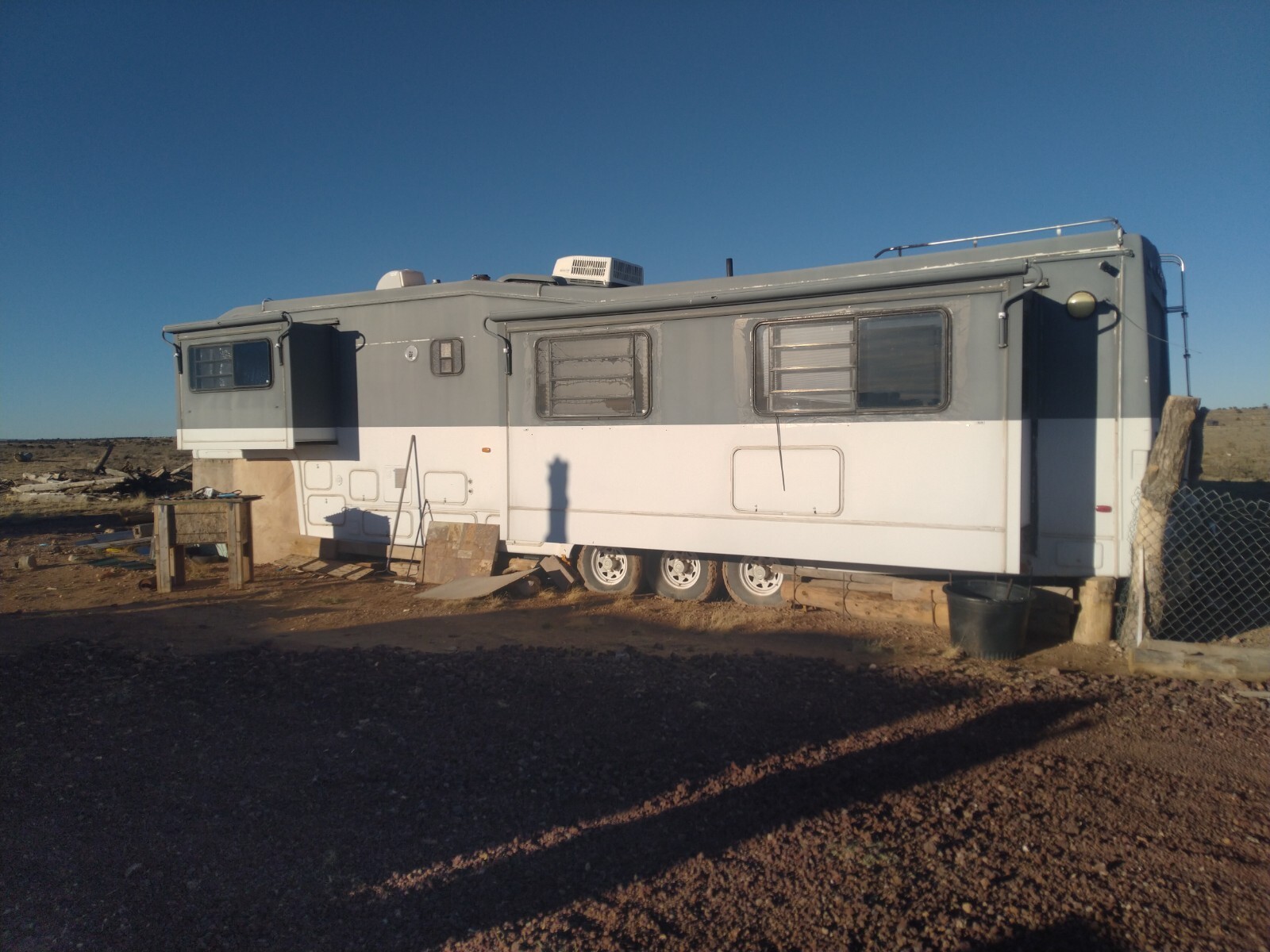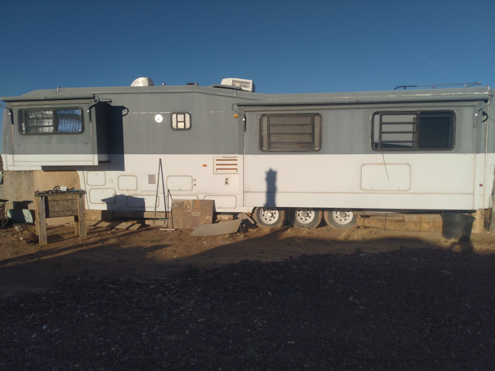 The 1996 Fifth Wheel Travel Trailer has a sleeping capacity for up to 4 people and comes equipped with 2 air conditioners for added comfort. This model features 3 slide outs for increased space and 2 awnings for outdoor shelter. With a length of 39 feet, this towable RV is perfect for road trips and camping adventures. Made in the United States, this clean and well-maintained trailer is sure to provide a comfortable and enjoyable travel experience for the whole family.