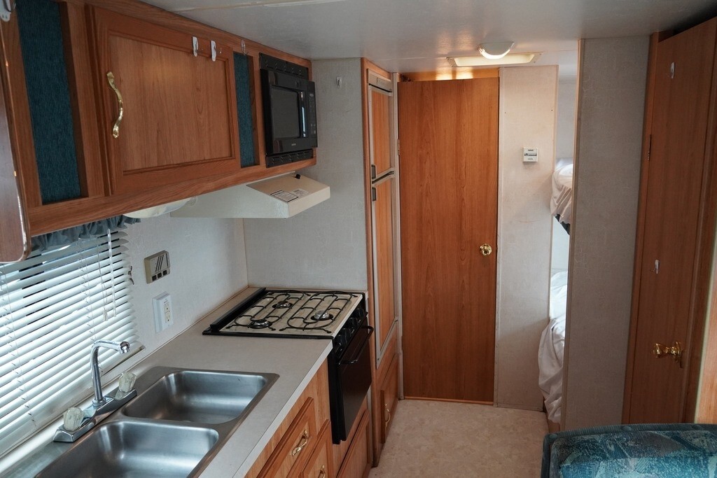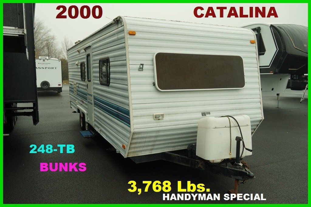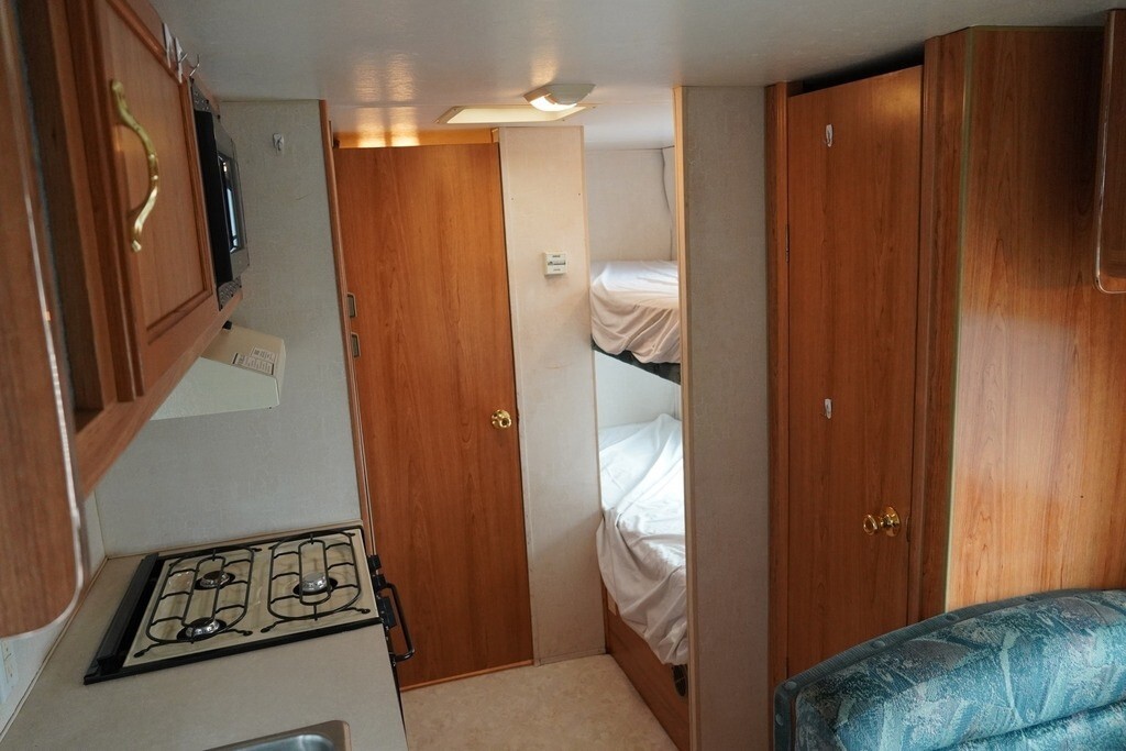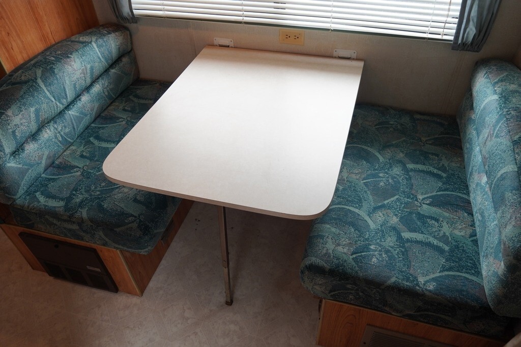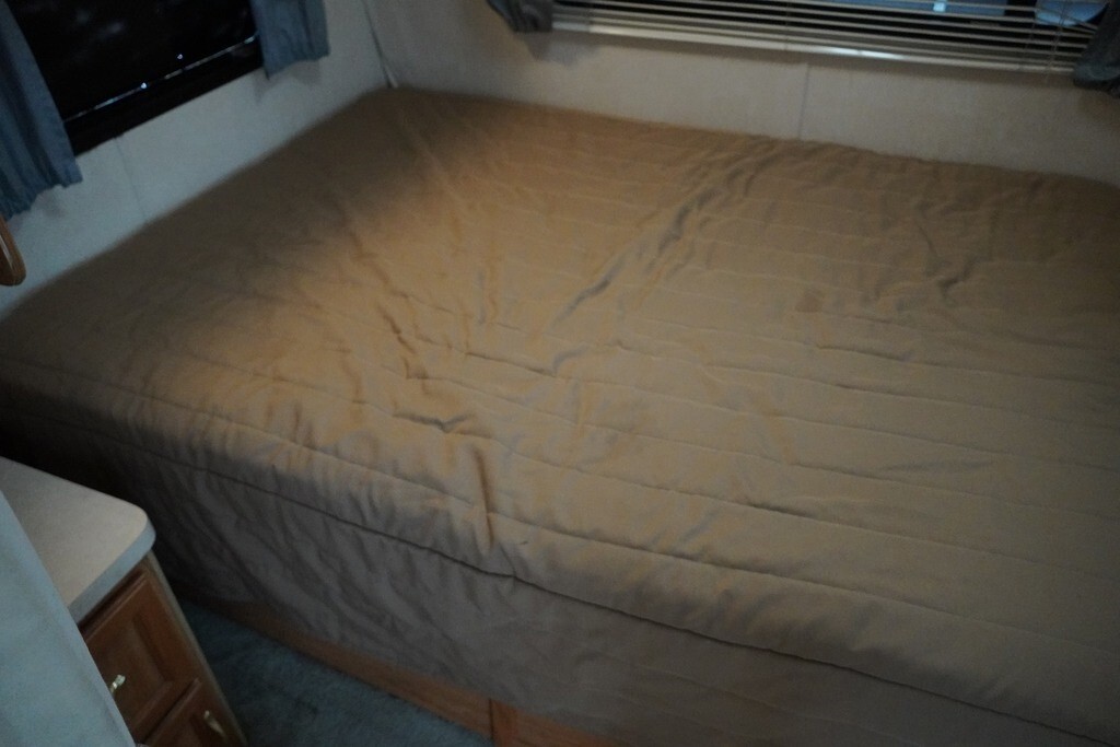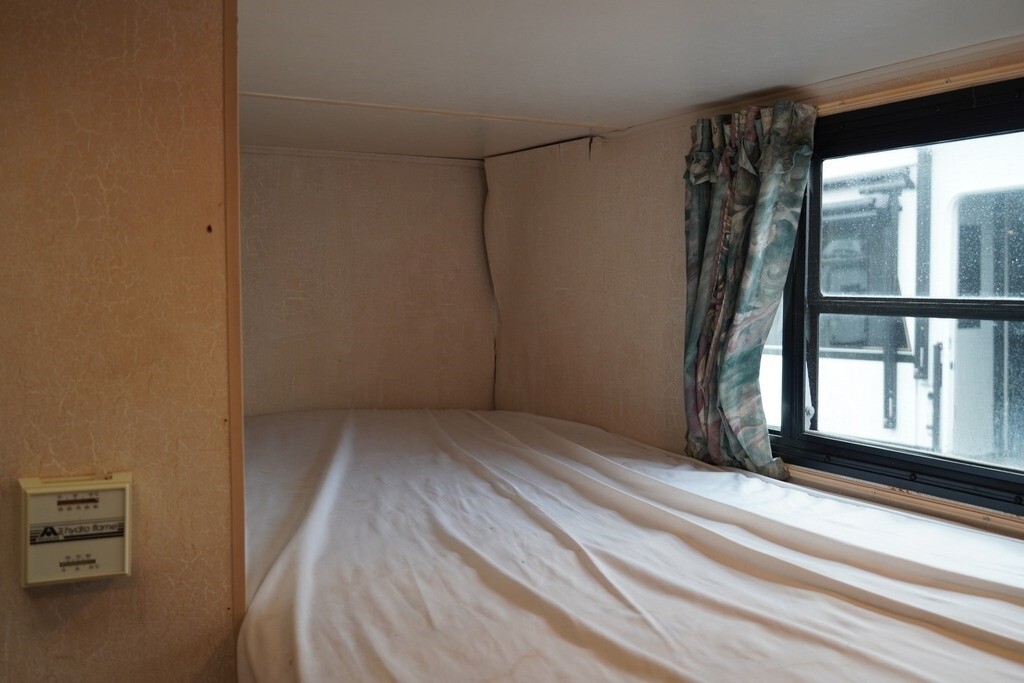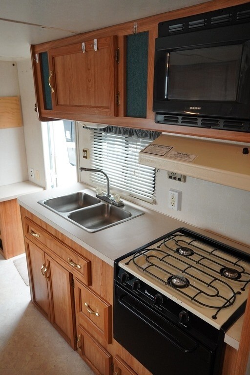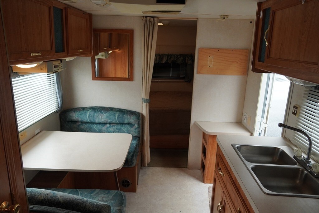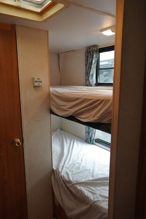 This trade in just showed up. If you are looking for a hunting cabin or office trailer this might work out well for you.Light weight compact Bunkhouse sleeps up to 6 peopleCondition:FAIRneeds back left corner mended. As you can see from the pics it has had water damage.AC Blows coldWater pump pumpsFurnace does not come on. Thermostat for it looks suspect.Fridge is temperamental. It will get cold sometimes others not. I would replace with 12 V.Floor is solid except between toilet and cabinetcloth upholstery is in good condition.
