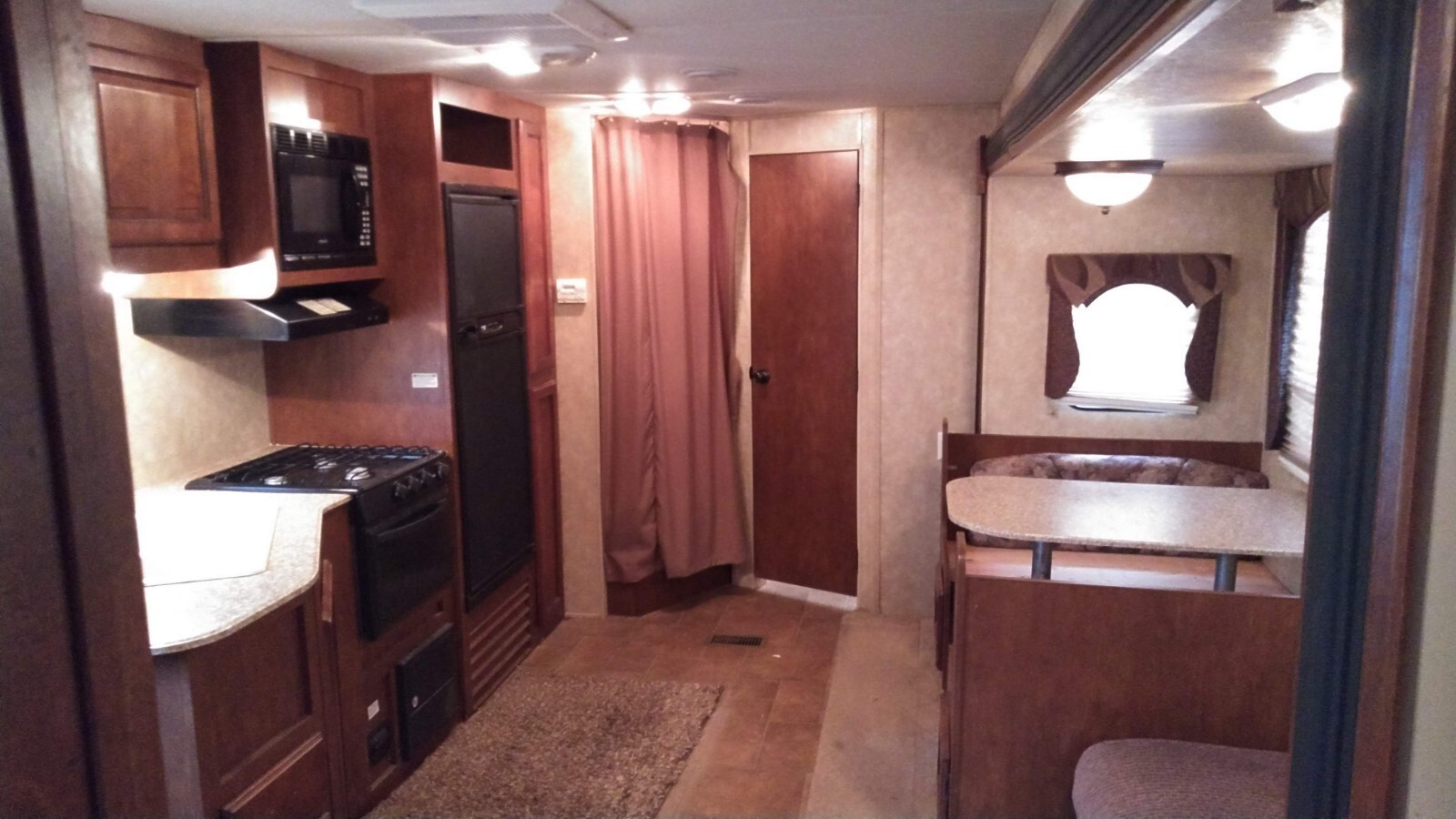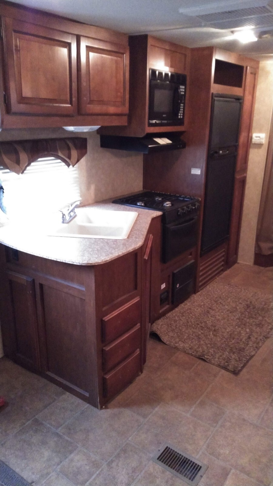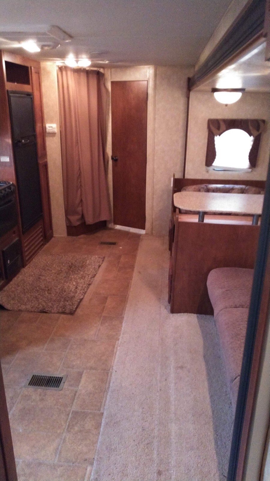 Just got this camper from insurance company due to minor cosmetic damage. Cant see anything on outside other than dent in siding. Inside super solid, floors good. Cabinets will need handles for some reason as you can see. See photo for interior paneling behind master bed broke. dont think water issue since pretty much in middle of front fiberglass. I also notice a broken interior panel inside the cabinet to right of the bed, but dont see where that would have happen from the outside. One prior minor leaks look like right above entry door at one time, otherwise solid throughout. See last phot, you will notice prior roof repair, pouring rain right now, no leaks inside.