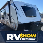 Camp comfortably in this 215RBK Apex ultra lite trailer by Coachmen RV. This model features a complete rear bath with angled shower, toilet, sink with medicine cabinet, and a storage wardrobe that is above the outside kitchen.
