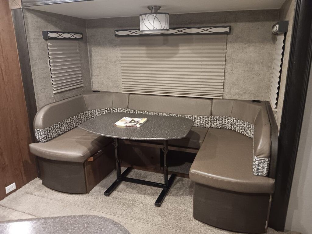 Step inside and youll find an open, airy living space with rich cabinetry, brushed nickel hardware, and easy-clean flooring. The U-shaped dinette and sofa provide flexible seating for meals, games, or relaxing after a day outdoors. The full kitchen is built for real cooking, featuring a three-burner range with oven, microwave, double-basin sink, and a spacious refrigerator, plus thoughtful storage for everything from snacks to cookware.