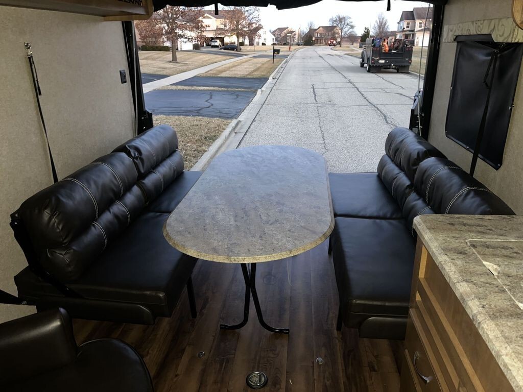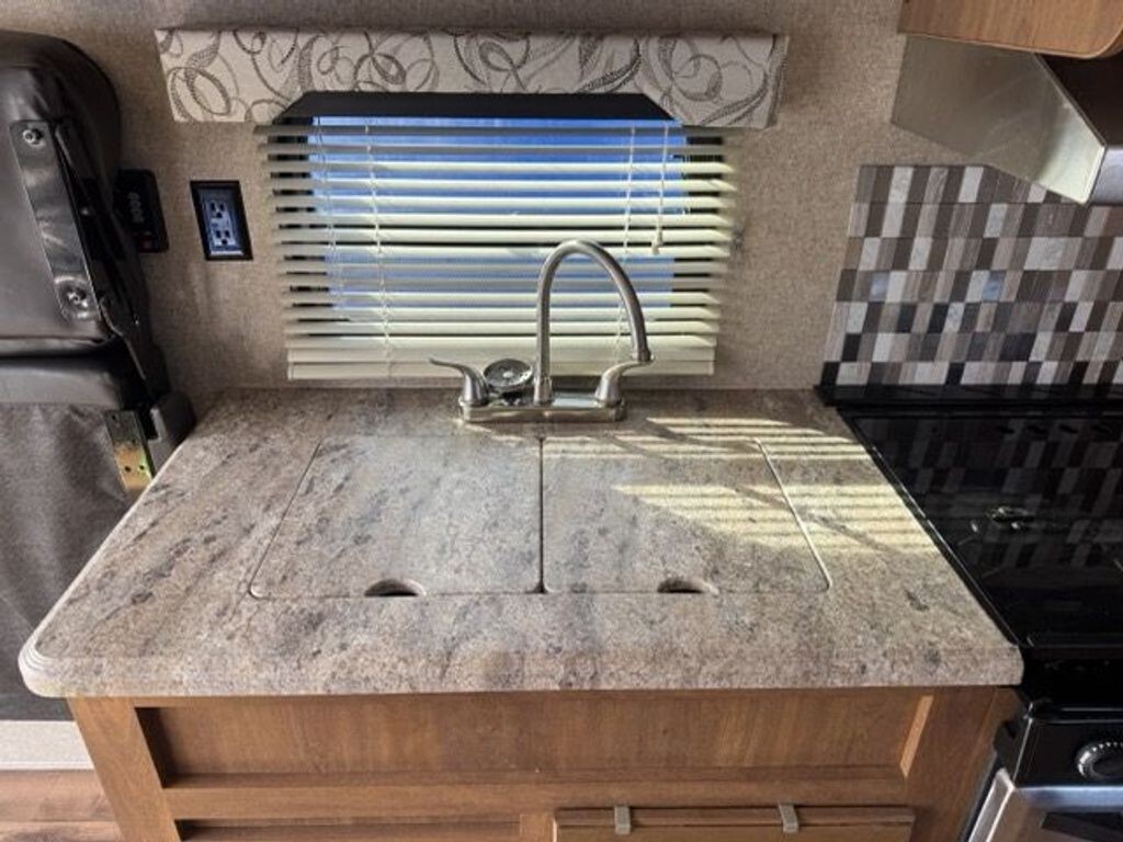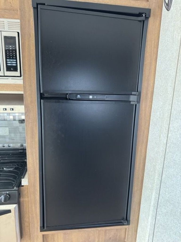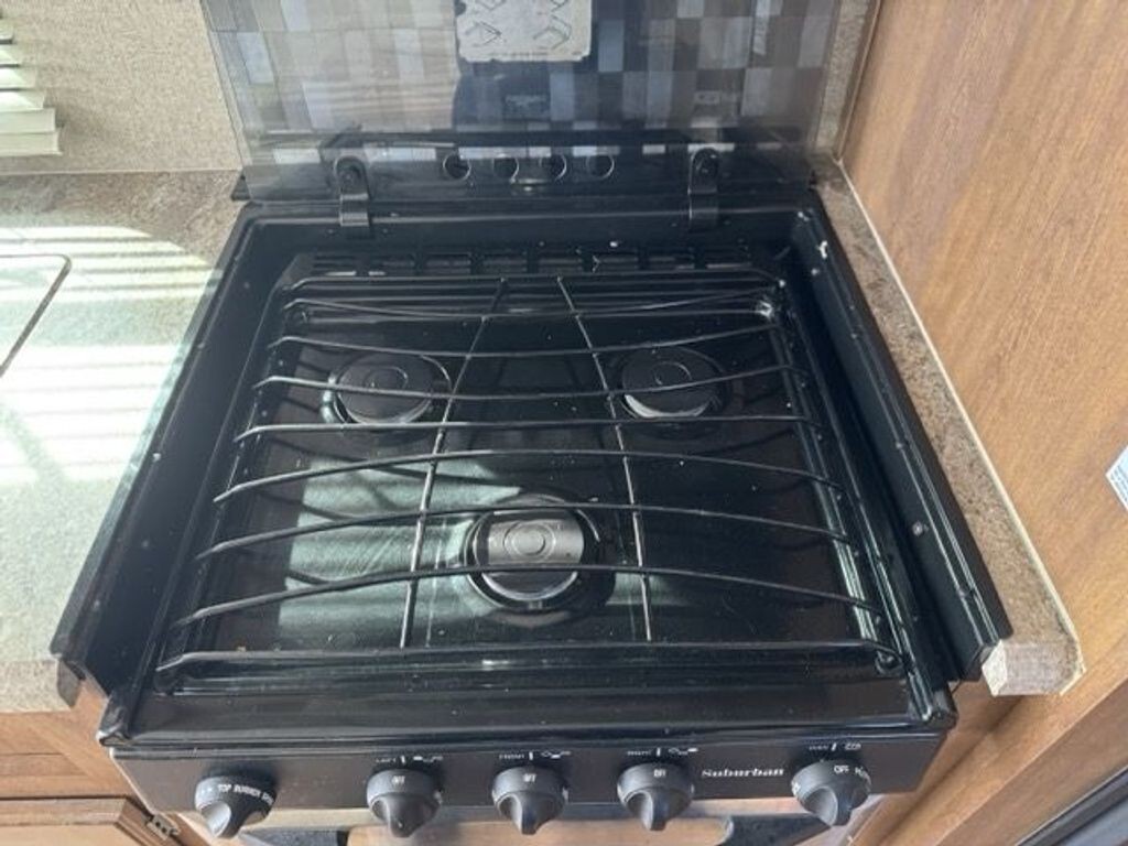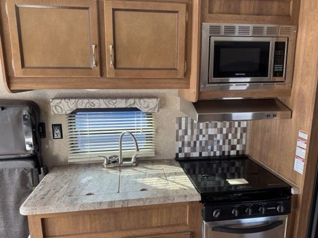 Fully Equipped Kitchen: Enjoy home-style meal prep with a three-burner range, microwave, deep sink, and refrigerator. Plenty of countertop and cabinet space makes cooking on the road a breeze.