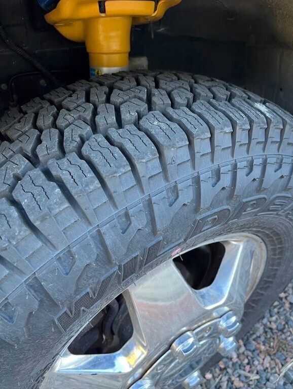 Dually rear wheel drive vehicle with new Falken Wildpeak all-terrain tires. Because it has been lifted with all-