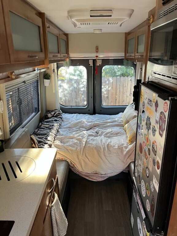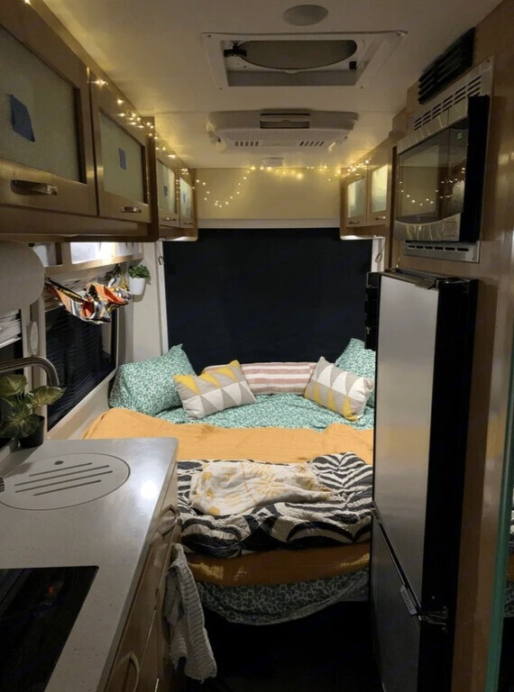 - Rear couch that converts into a queen-sized bed with an electric motor push button