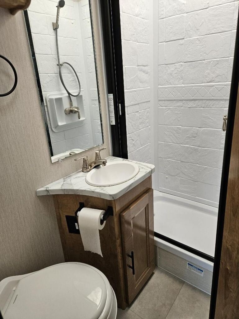 Sleeping accommodations are versatile and comfortable, offering a rear queen bed plus an upper bunk that sleeps two, allowing this compact coach to comfortably accommodate family or guests. The private bathroom with enclosed shower adds residential convenience on the road.