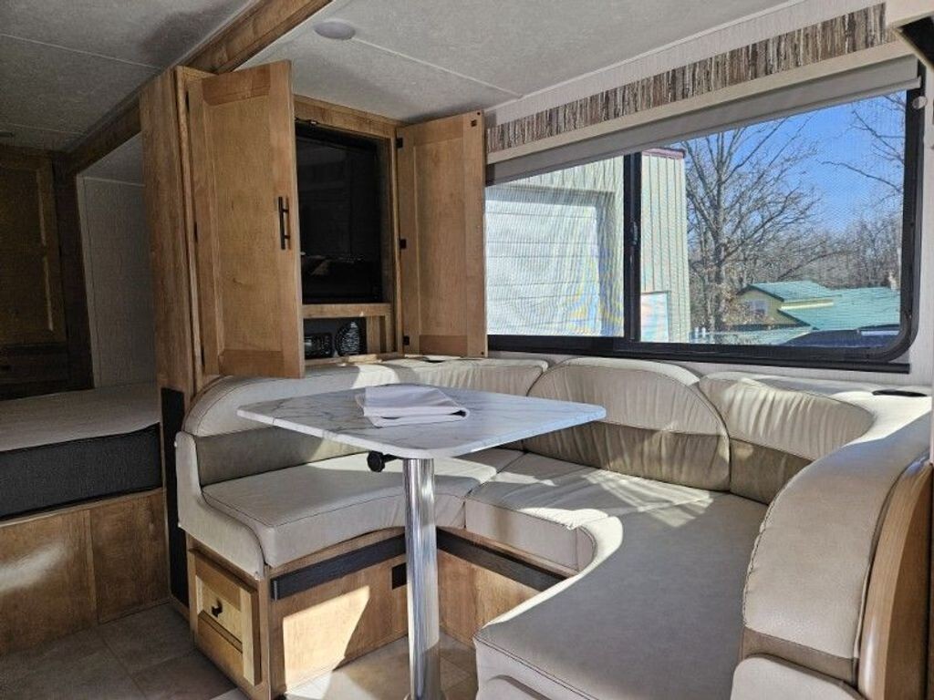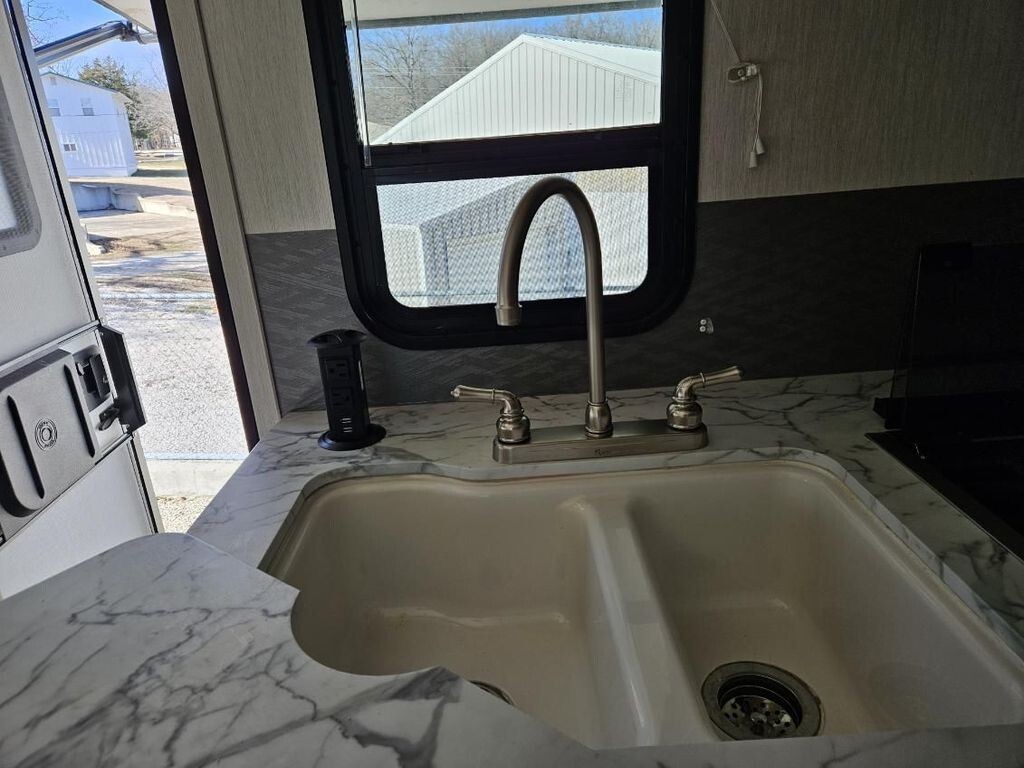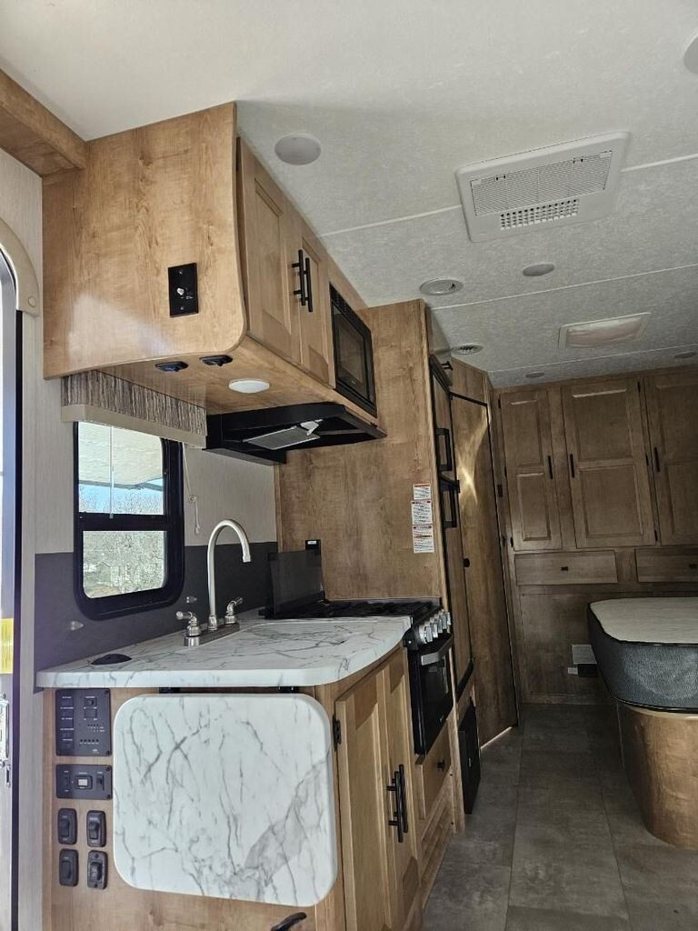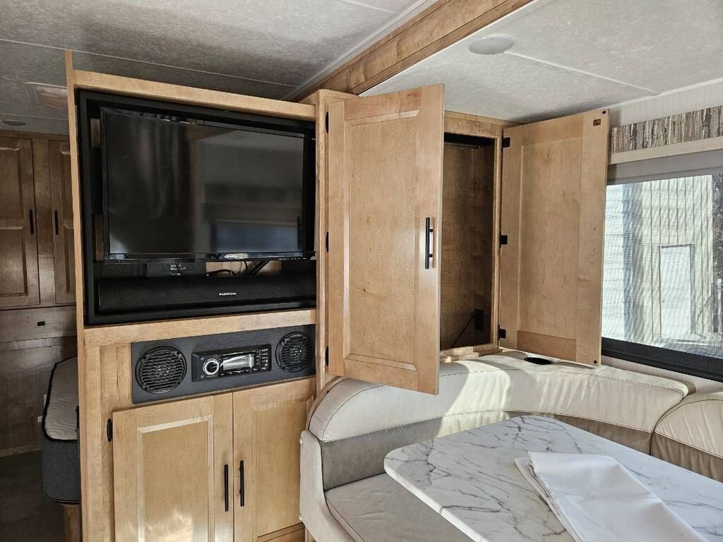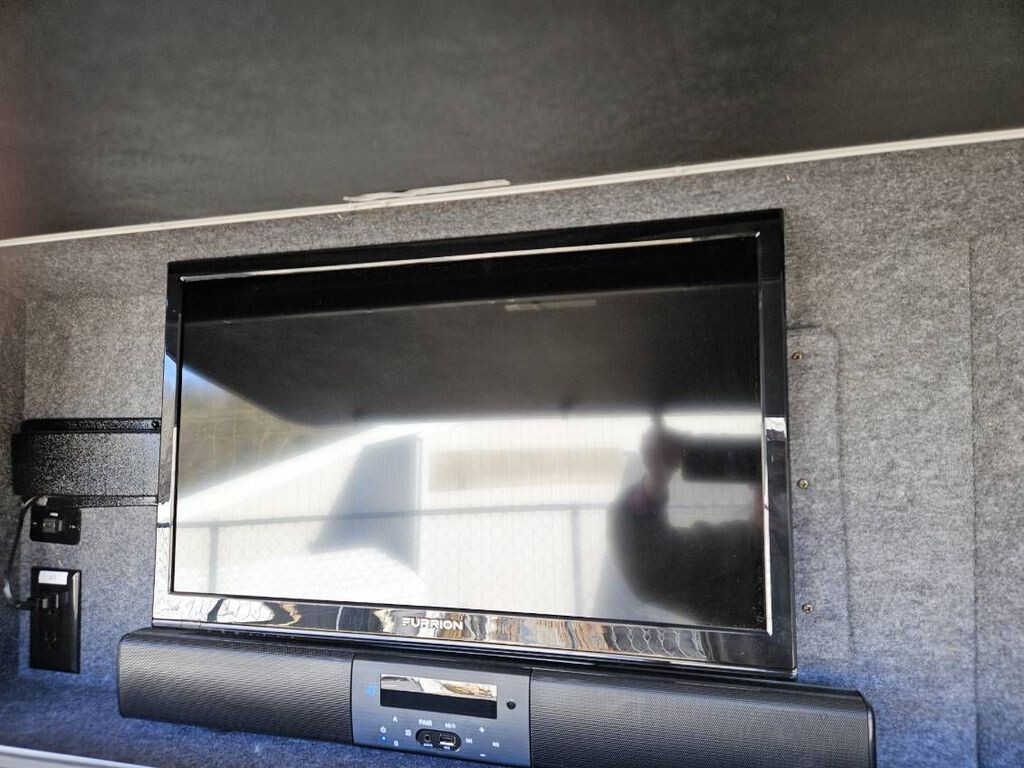 Inside, youll find a thoughtfully designed interior that maximizes space and comfort. The living area includes two flat-screen TVs for entertainment, a well-appointed galley with microwave, gas cooktop, sink, refrigerator (no ice maker), and a small freezer, making meal prep easy whether youre on a weekend getaway or extended trip.