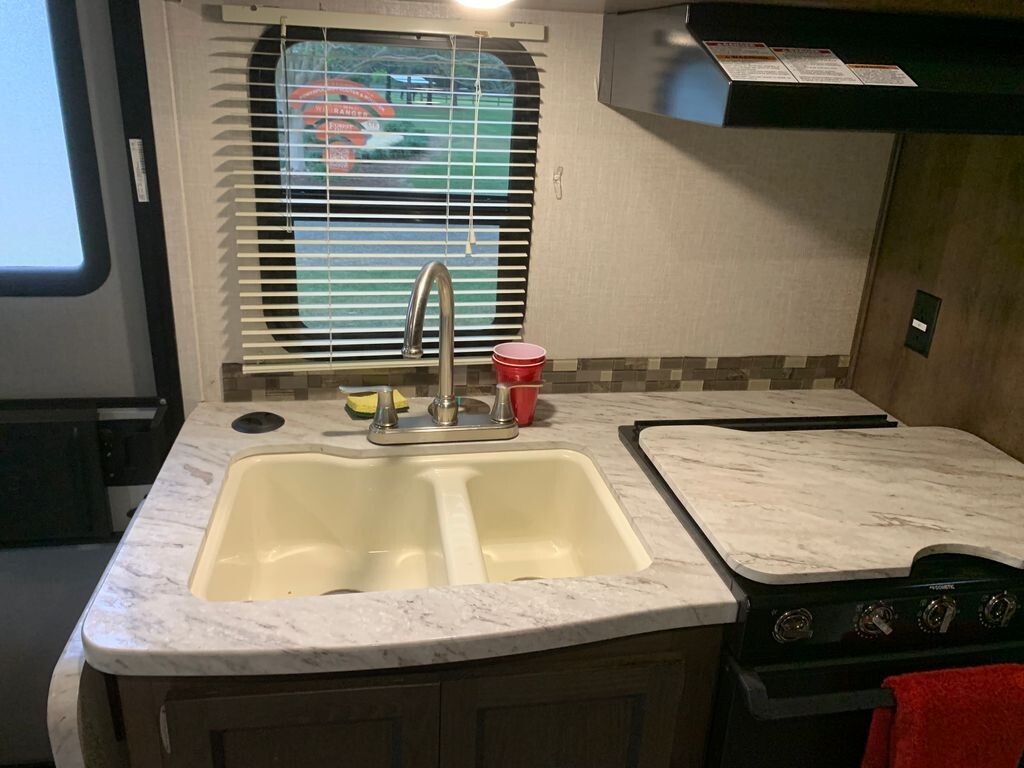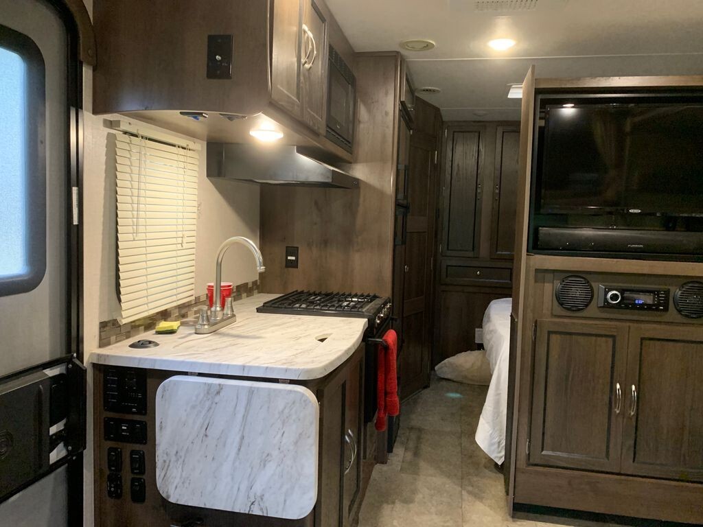 Step inside and youll find a thoughtfully optimized interior that feels spacious and welcoming. The smart floorplan centers around a comfortable seating area that easily converts into restful sleeping space, perfect for cozy nights after big days outdoors. The fully equipped kitchen boasts a refrigerator, sink, cooktop, and ample counter space ideal for preparing hearty meals or quick snacks on the go.