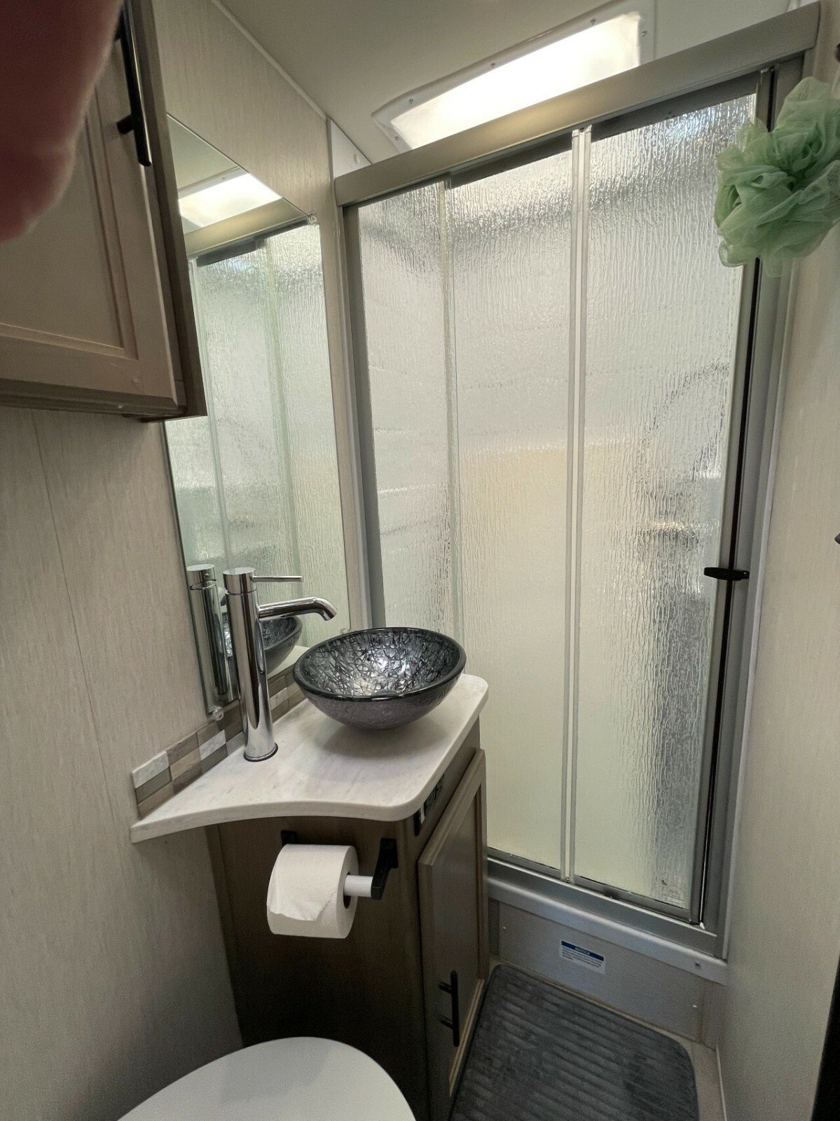 Big designer bathroom has a beautiful vessel sink which adds yet another dimension to this very modern RV.