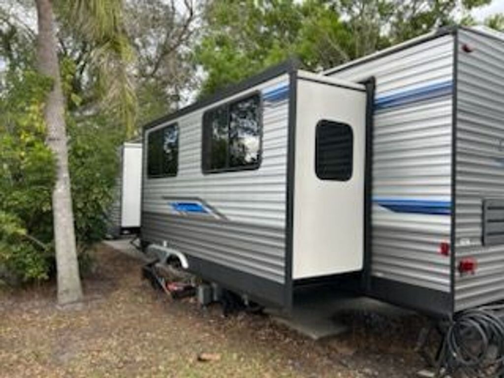 Exterior: Comes with a 21-foot LED-lit awning, 100W solar panel, a fully enclosed underbelly, and an outdoor refrigerator.