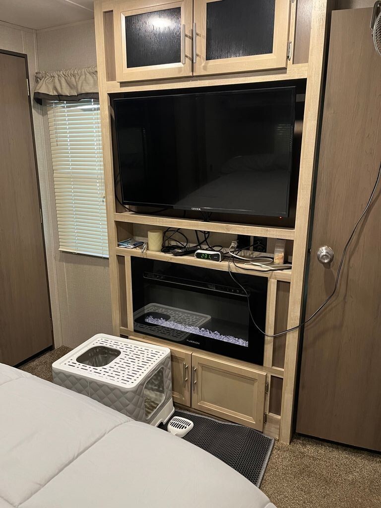 Living Area: Features a 39-40 inch TV, a 5,000 BTU electric fireplace, a sleeper sofa, and comfortable recliners.