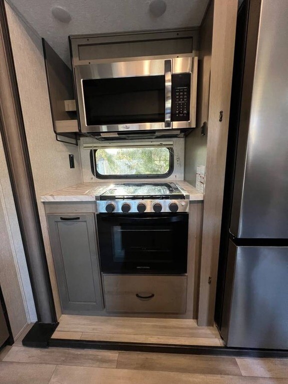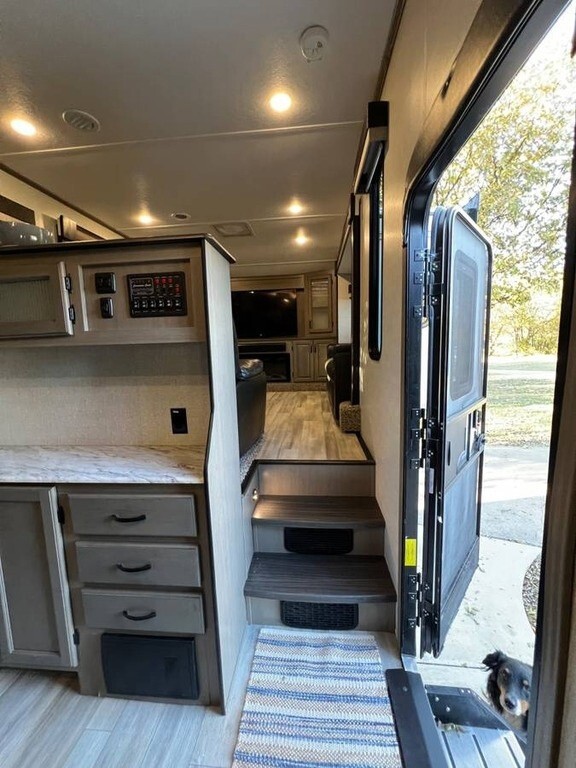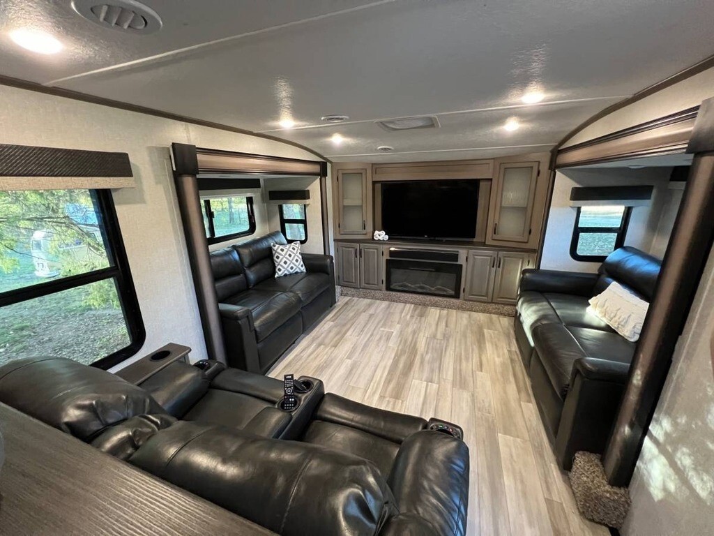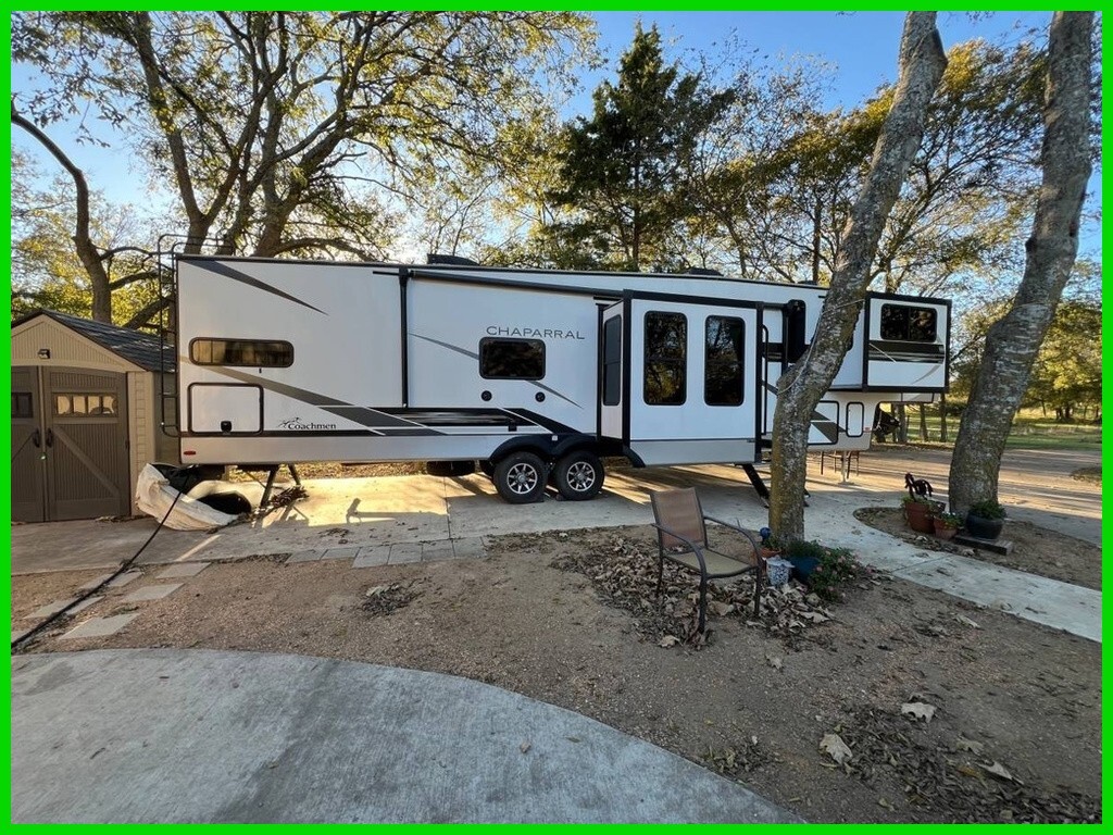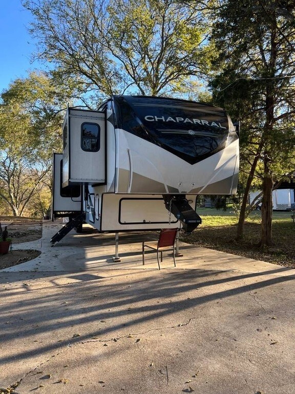 For sale is a 2022 Coachmen Chaparral 334FL Fifth Wheel, offering a beautiful living space and everything you need for the road. This unit is in excellent condition, ready for your next adventure. The spacious kitchen features a stove, oven, microwave, and a full-size French door fridge, with a hook-up for a washer/dryer combo unit for added convenience. The bathroom is luxurious, with two sinks, a spacious vanity, and a large shower. The master bedroom includes a king-sized bed, a generous closet, and a built-in dresser for plenty of storage. Enjoy meals at the dinette with four chairs, and relax in the luxury leather sofas and chairs that are incredibly soft. For extra comfort, the two recliners come with massage and heat functions. The living area also boasts a large TV with console storage and a built-in electric fireplace. Outside, you'll find an electric awning, leveling system, an outdoor mini-fridge, a hand-held shower, and plenty of storage underneath. The same unit is listed at $68,000 at dealerships—save on fees by buying directly from an individual!