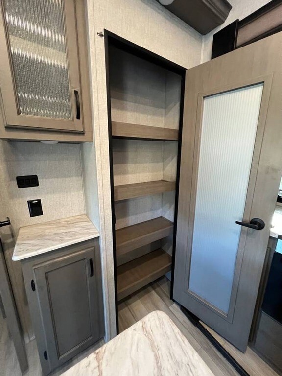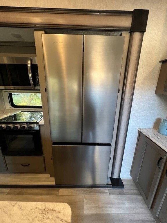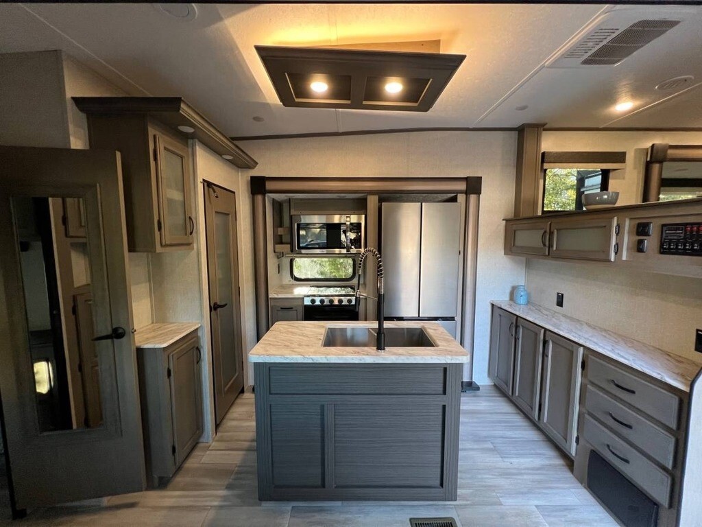 2022 Coachmen Chaparral 334FL Fifth Wheel For sale is a 2022 Coachmen Chaparral 334FL Fifth Wheel, offering a beautiful living space and everything you need for the road. This unit is in excellent condition, ready for your next adventure. The spacious kitchen features a stove, oven, microwave, and a full-size French door fridge, with a hook-up for a washer/dryer combo unit for added convenience. The bathroom is luxurious, with two sinks, a spacious vanity, and a large shower. The master bedroom includes a king-sized bed, a generous closet, and a built-in dresser for plenty of storage. Enjoy meals at the dinette with four chairs, and relax in the luxury leather sofas and chairs that are incredibly soft. For extra comfort, the two re