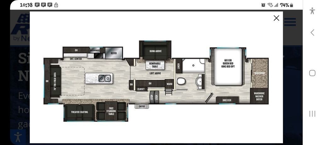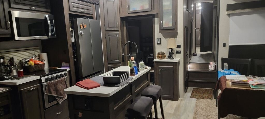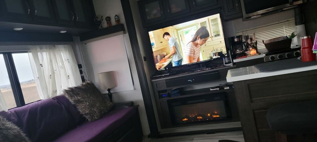 From the moment you enter, youll notice the upscale craftsmanship and comfort-forward design. The interior features solid surface countertops, rich cabinetry, and a gourmet kitchen equipped with a 4-burner range and oven plus a stunning full residential refrigerator, making extended stays effortless. The living area invites you to unwind with plush theater seating, a cozy electric fireplace, and not one but two TVs, including a brilliant 4K Smart LED TV for movie nights or game days.