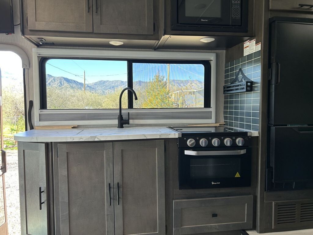 The spacious living area is designed for comfort and entertainment, highlighted by two flat-screen TVs, allowing everyone to relax and enjoy their favorite shows whether youre lounging inside or unwinding after a day of exploring. The thoughtfully laid-out kitchen provides ample counter space, premium appliances, and abundant storageperfect for preparing meals on the road with ease.