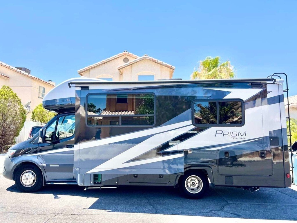 2023 Coachmen Prism Elite 24FS Class C Motorhome For sale is a 2023 Coachmen Prism Elite 24FS Class C Motorhome, built on a reliable Mercedes chassis that makes driving a breeze. Its compact frame, adaptive cruise control, and lane assist practically let it handle the highway for you. Side and rearview cameras further enhance safety, simplifying merging and parking. Despite its manageable size, this motorhome offers ample storage for longer trips and boasts smart features that can be controlled via Bluetooth or a touch-screen panel. Recent upgrades include two brand-new house batteries, two new front tires, a Furion tankless hot water heater, and a new slide-out awning. Plus, purchasing in Nevada means no taxes on used vehicle sale