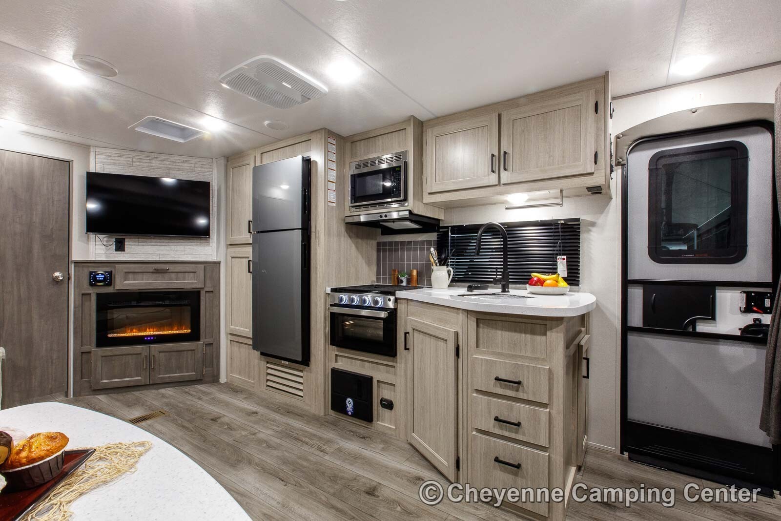 The Catalina Legacy Edition 263BHSCK is very well equipped! Outside, you’ll have a camp kitchen with a refrigerator & griddle, premium MORryde entry steps and handrail, Leash link for pets, battery disconnect, power awning with multicolor LED lighting, aluminum wheels, shower fixture, black tank flush fixture, and front pass-thru storage.