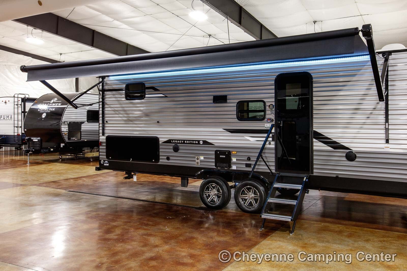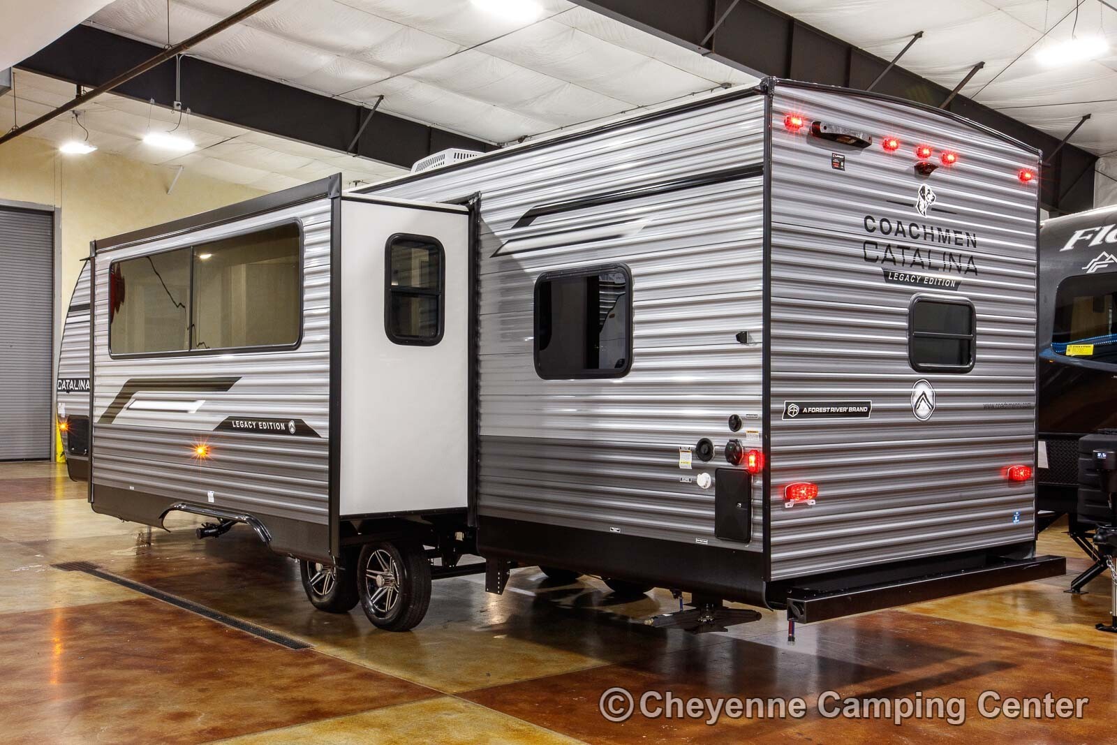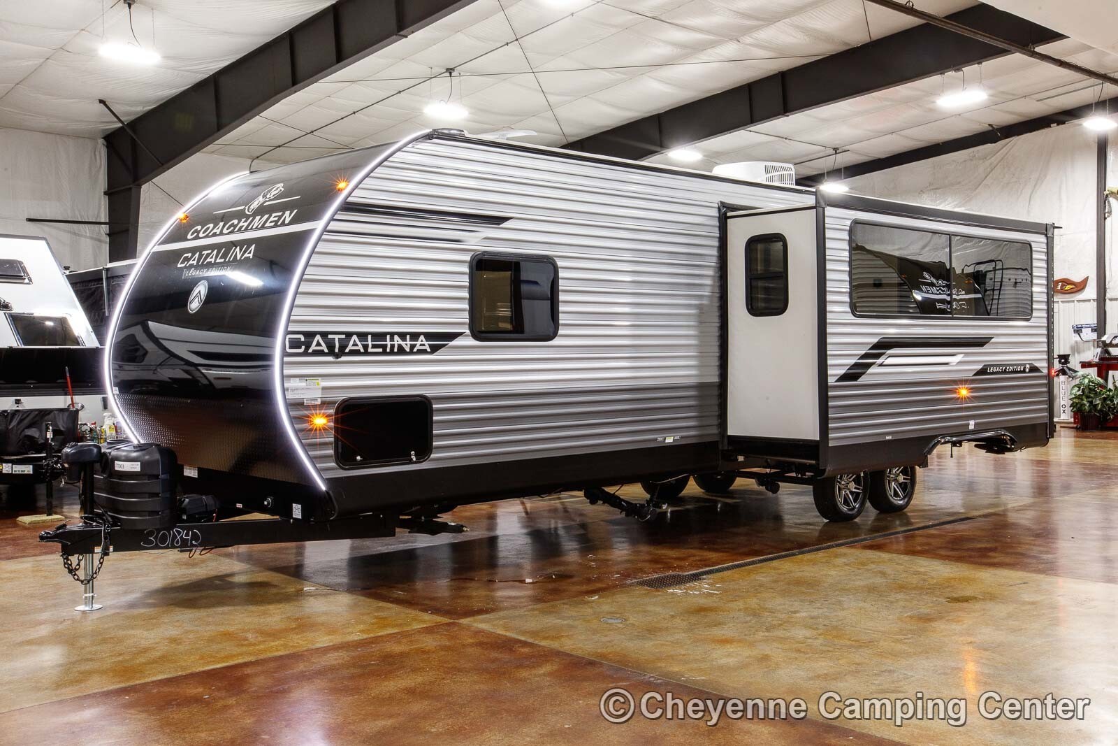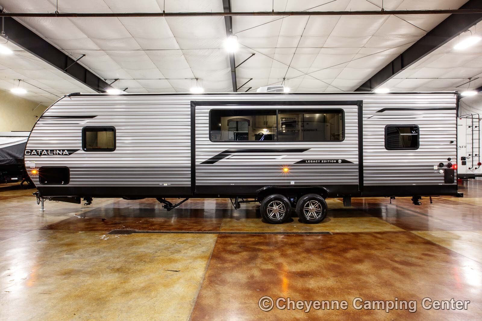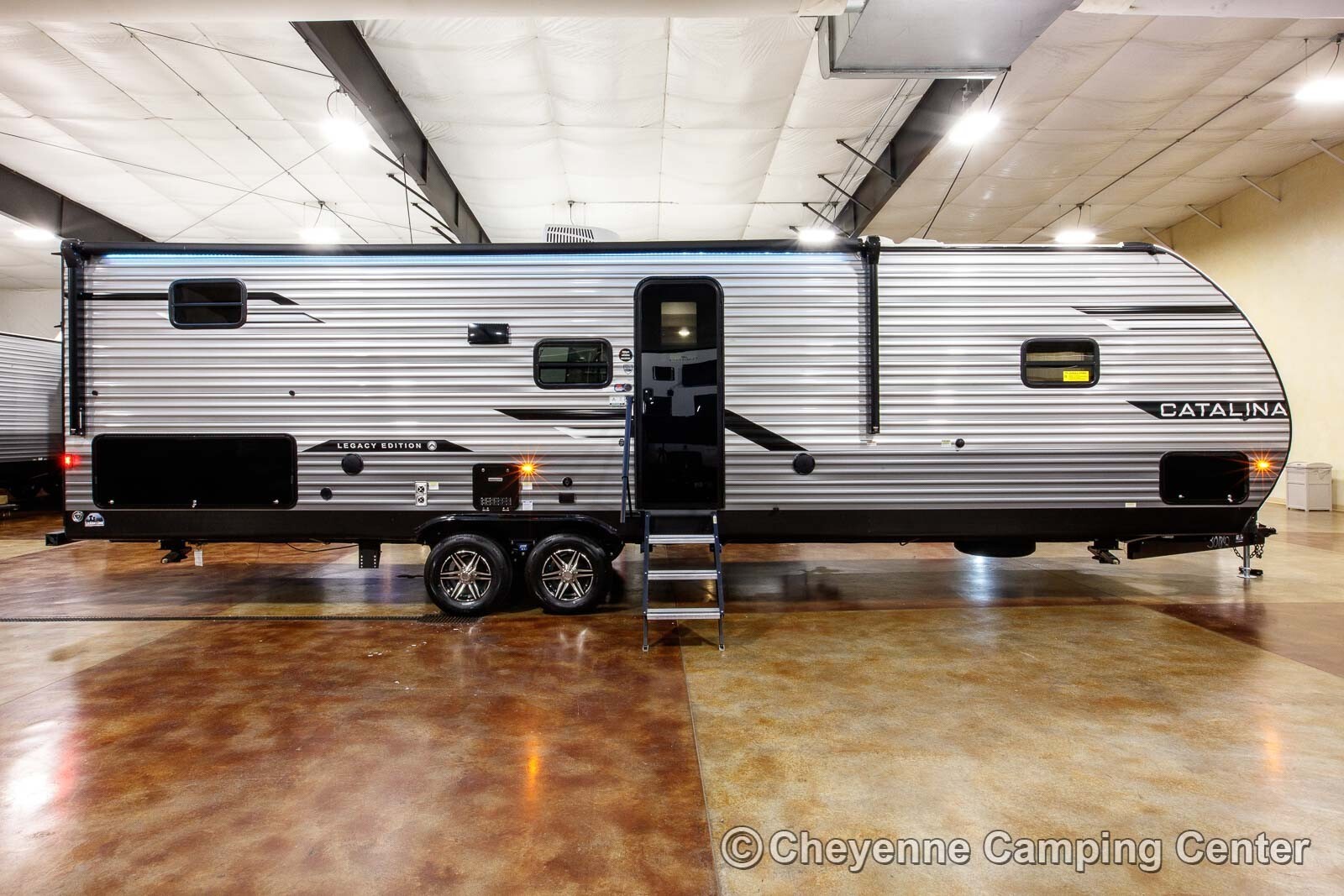 The Catalina Legacy Edition 293TQBSCK for sale at Cheyenne Camping Center also includes pleated window shades, ducted heat, 15K ducted GE air conditioner, a GE tankless water heater, an enclosed underbelly, filled LP tanks, 12V deep cycle RV battery, one year complimentary 24/7 roadside assistance, one year manufacturer warranty, and much more!