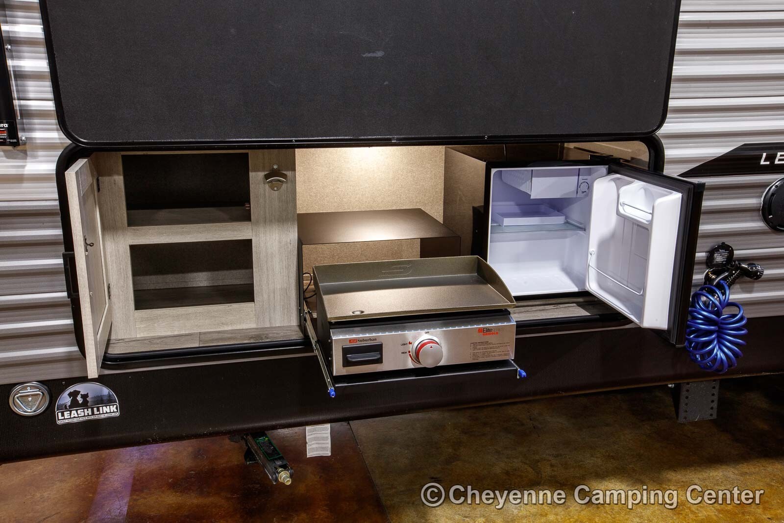 The Catalina Legacy Edition 293TQBSCK is very well equipped! Outside, you’ll have a camp kitchen with refrigerator, griddle, water, and storage, premium MORryde entry steps and handrail, Leash Link for pets, battery disconnect, power awning with multicolor LED lighting, aluminum wheels, shower fixture, black tank flush fixture, front pass-thru storage, and a flip-down cargo rack.