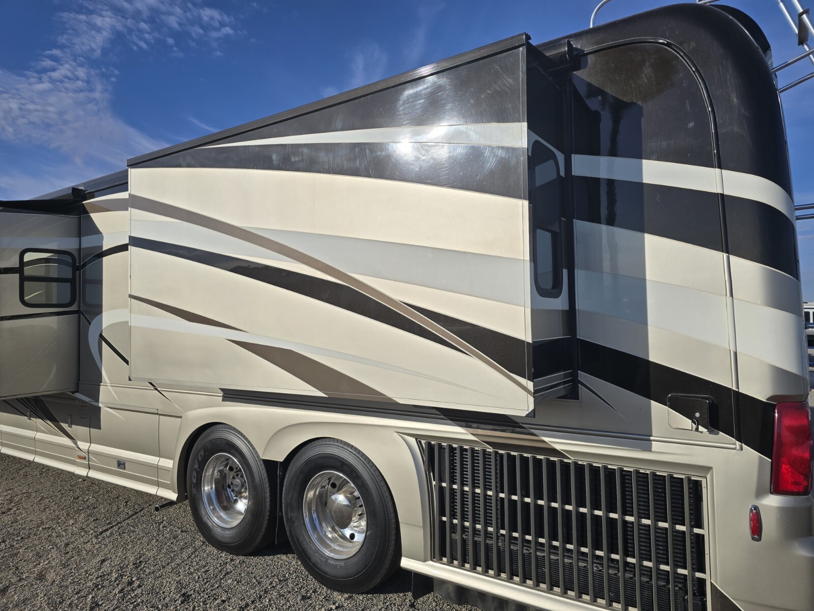Quad Slides, Heated Tile Floors, Pantry, Washer Dryer Prep, LCD Tvs, Power Leveling, Power Awnings, King Bed, 3 ACs, Sofa Sleeper, Diesel Generator, Full Body Paint and A Side Radiator.