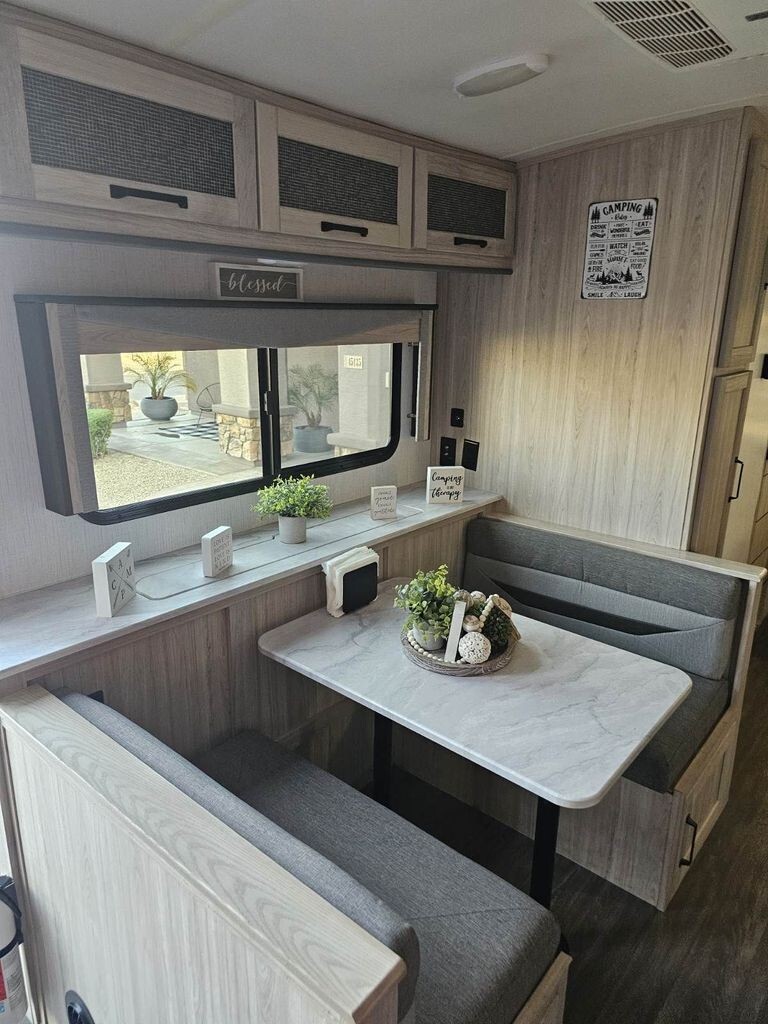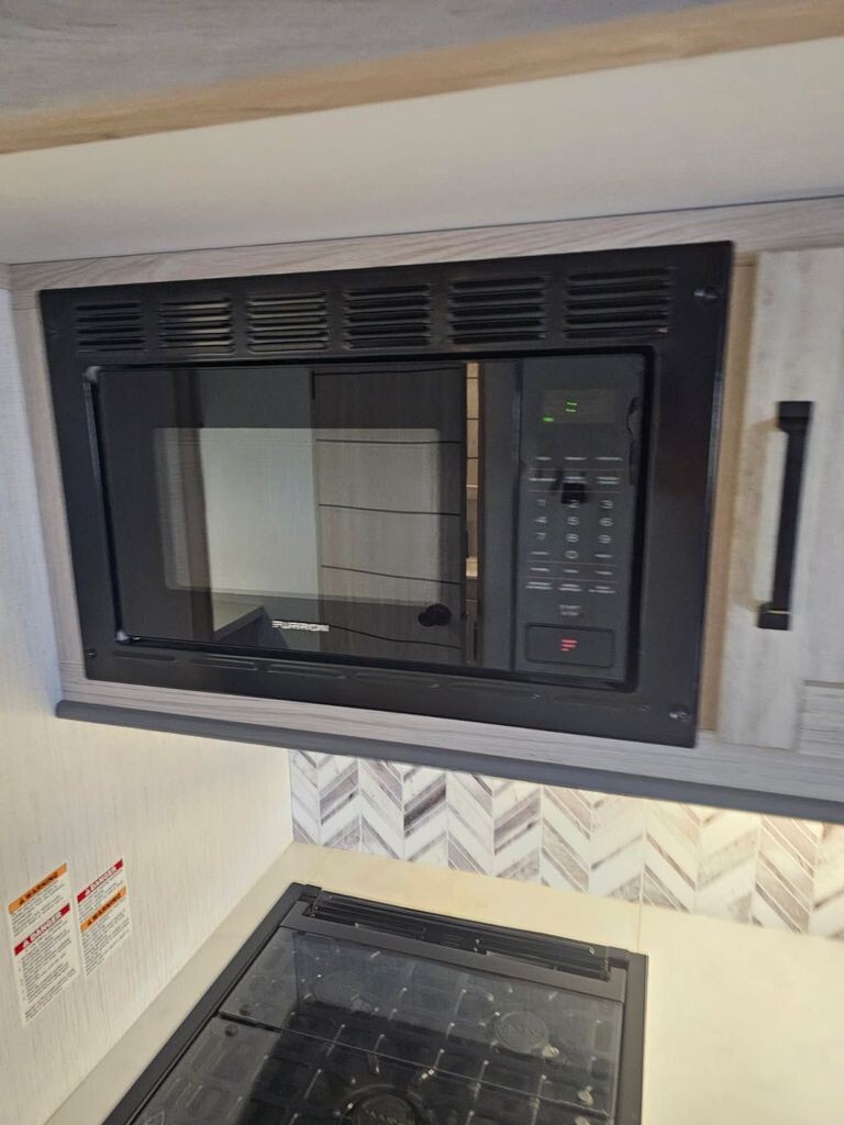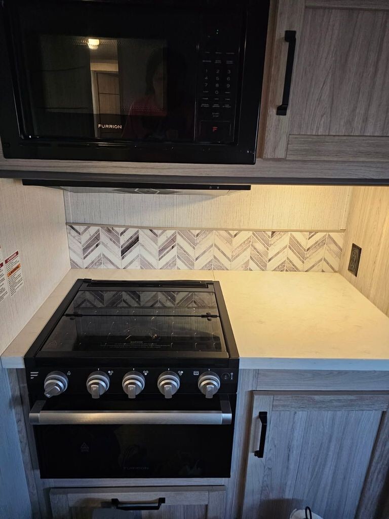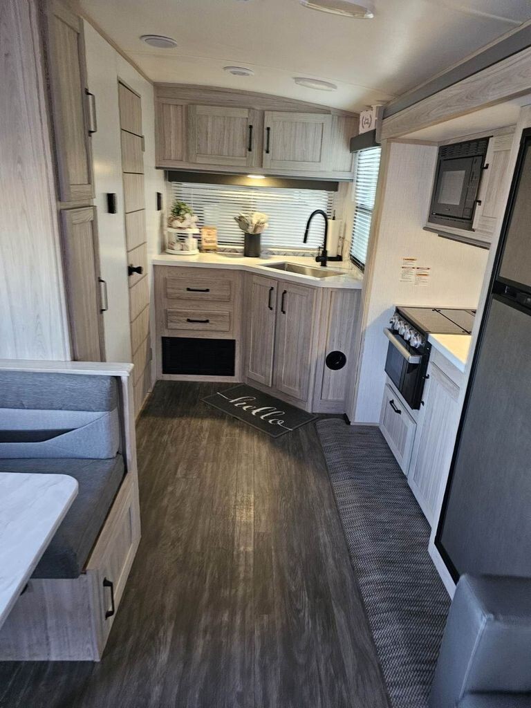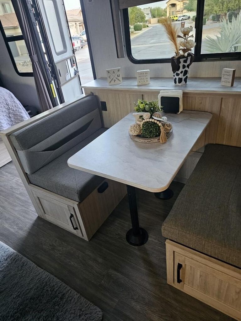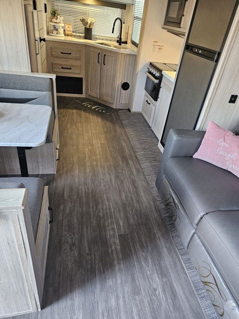 The well-equipped kitchen makes it easy to prepare meals wherever you travel, featuring solid countertops, a stainless steel refrigerator, microwave, three-burner cooktop, oven, and ample cabinetry for storage. A convenient dining space gives you the perfect spot for meals, morning coffee, or planning your next destination.