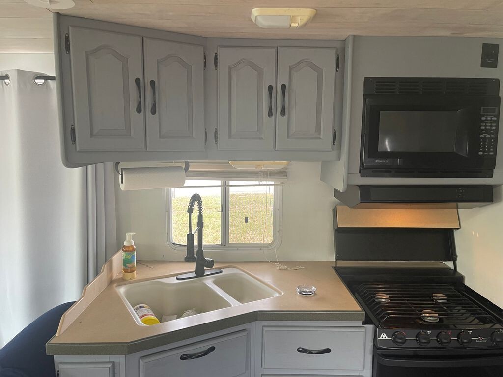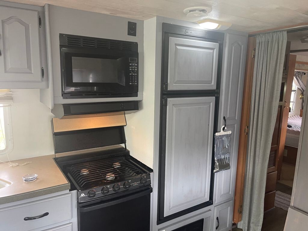 Inside, youll find a comfortable living area, a full kitchen with refrigerator, stove, oven, and microwave, plus a dining space for meals or relaxing. The rear bedroom features a walk-around queen bed and plenty of storage, while the bathroom includes a shower, toilet, and vanity.