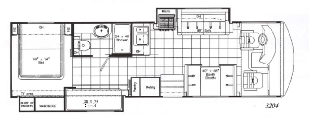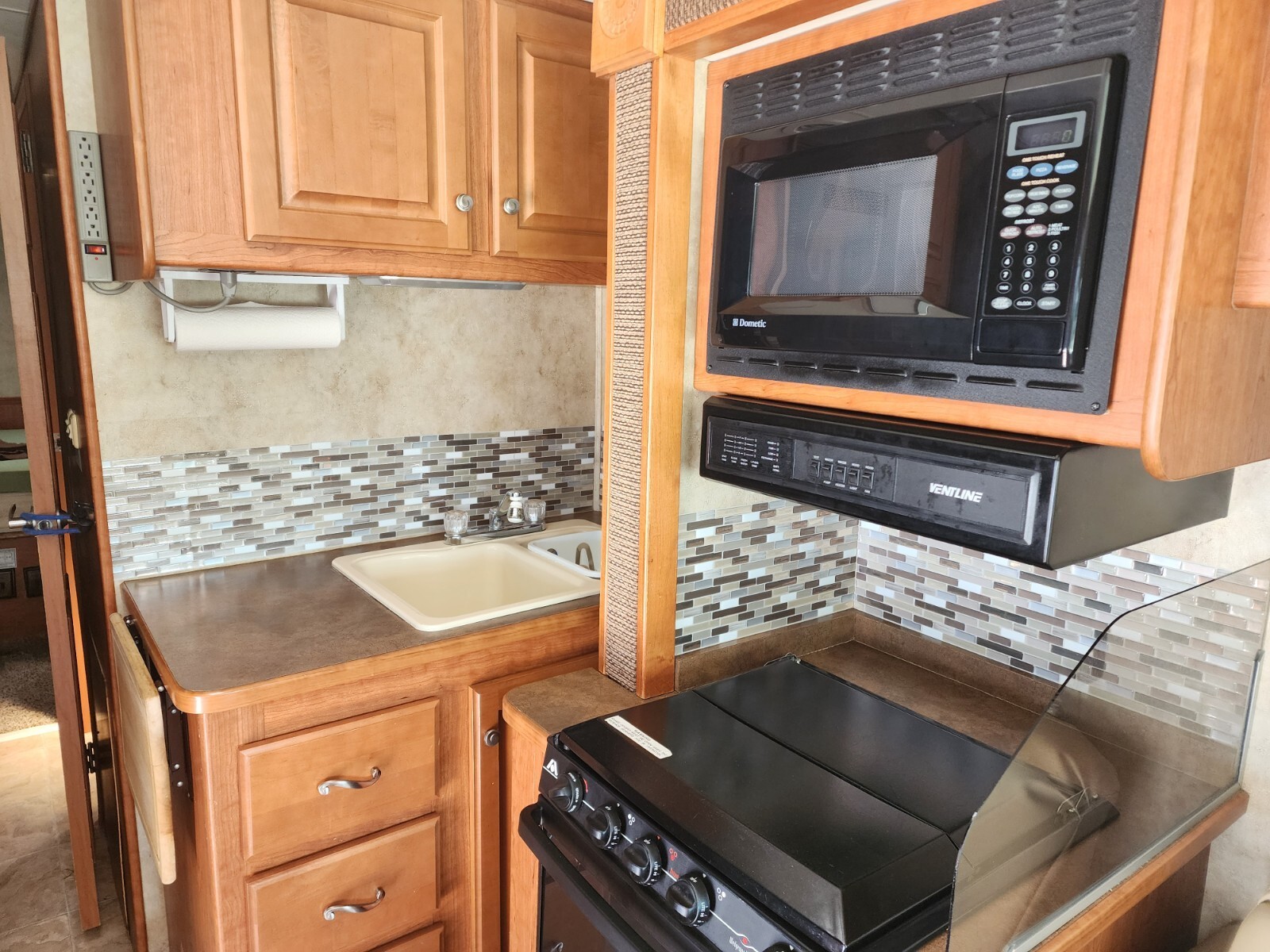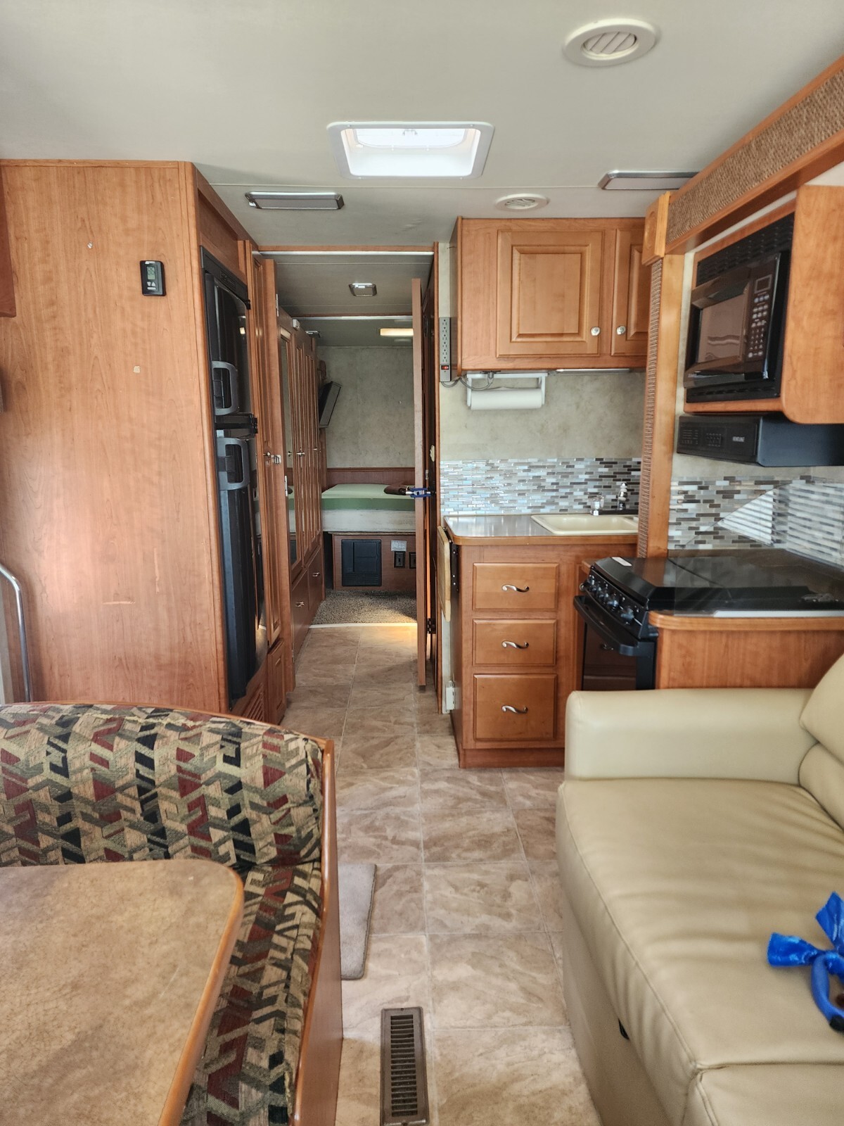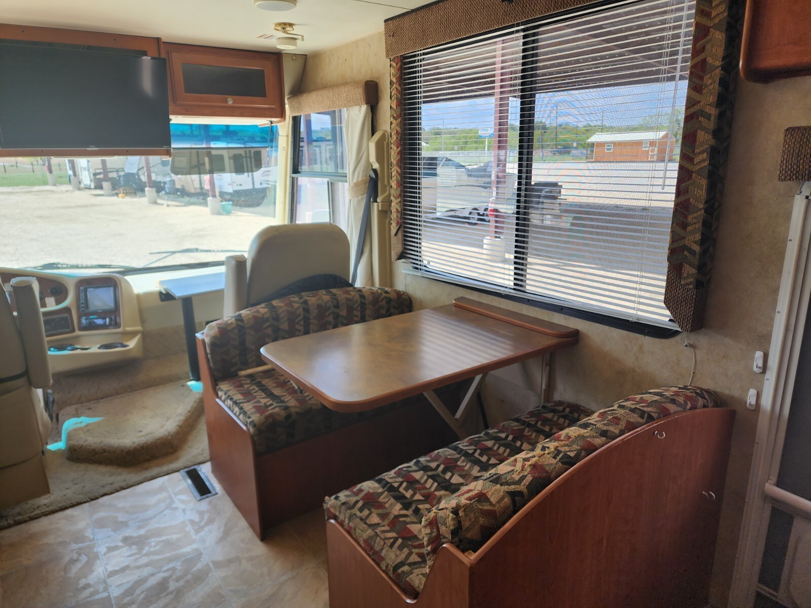 Full kitchen including a sink, a three burner range with microwave oven, and a 2-way refrigerator/freezer. There is also plenty of storage for all of your dry and canned goods. Have a seat at the comfortable dinette.