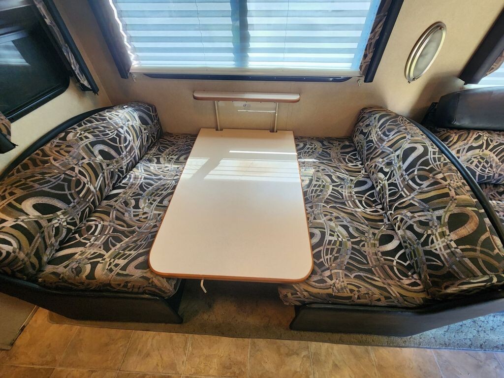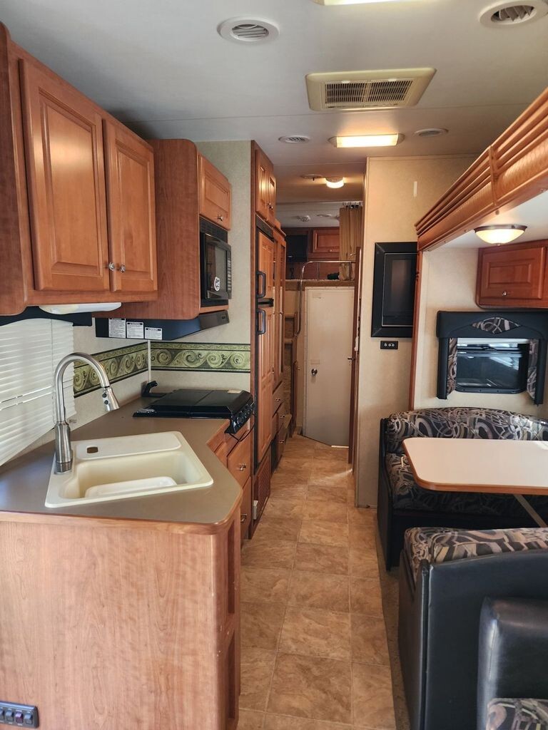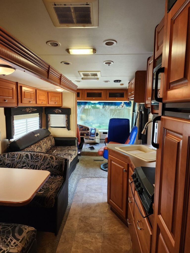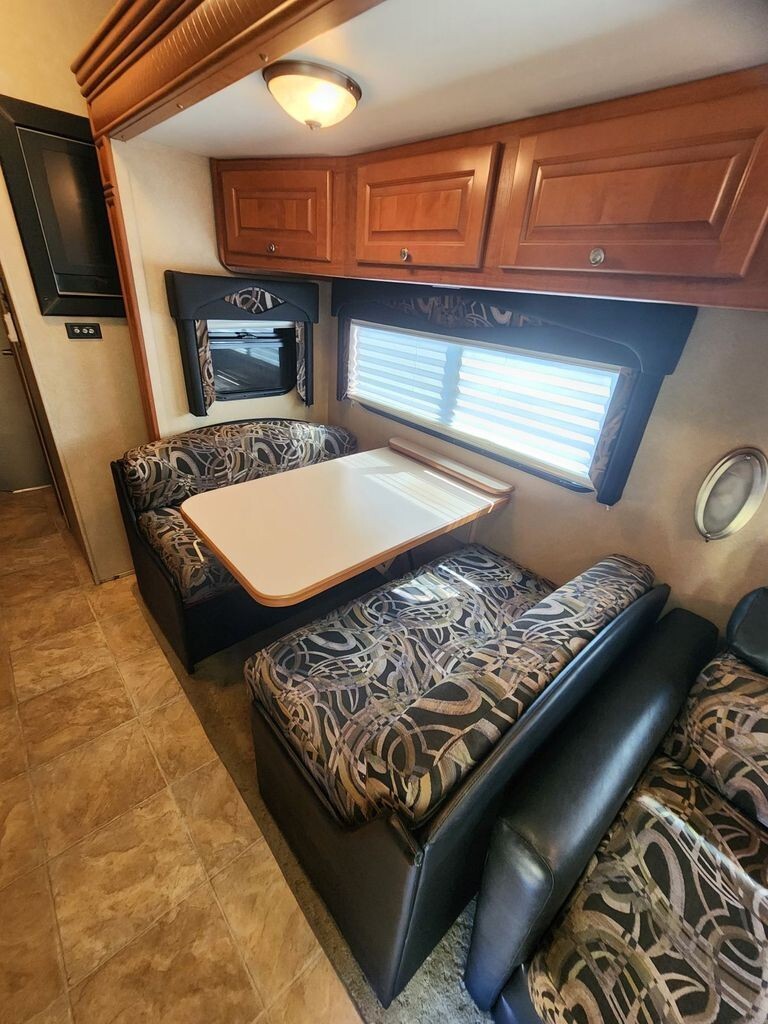 The main living area features plush seating, generous storage, and an open floorplan ideal for entertaining or relaxing after a long day on the road. A fully equipped kitchen includes solid-surface countertops, ample cabinetry, refrigerator, microwave, and stoveperfect for preparing meals on the go. The private master suite offers a comfortable bed, wardrobe storage, and a peaceful retreat, while the well-appointed bathroom provides residential-style convenience.