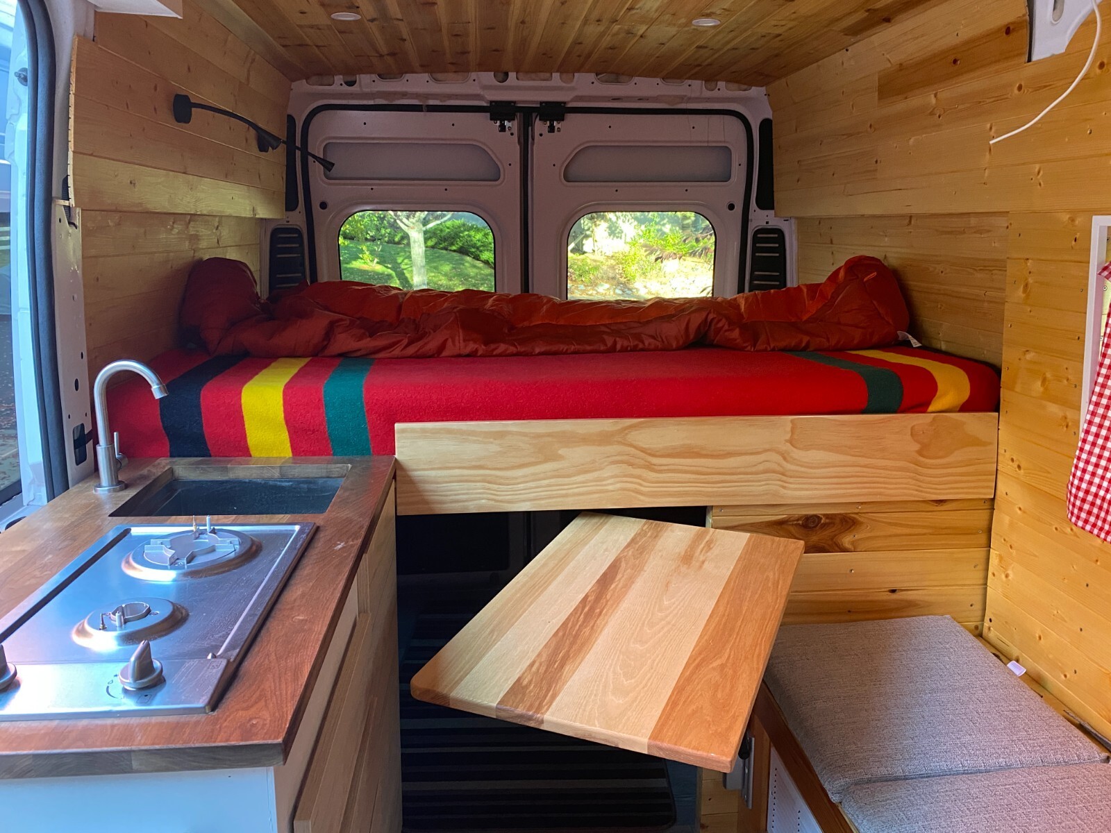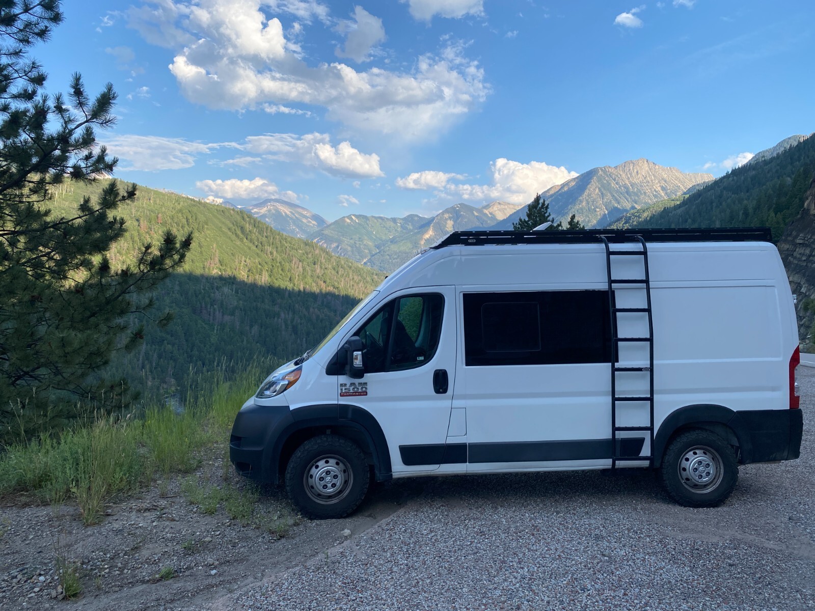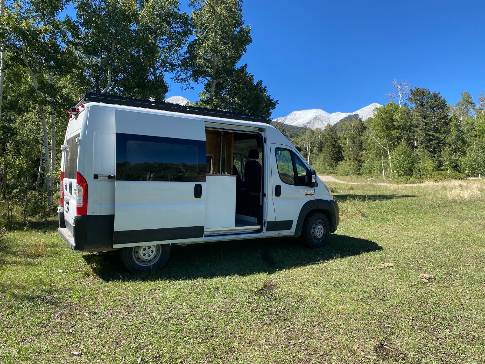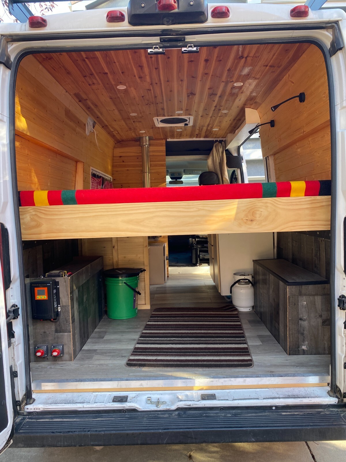 This is a DIY 2020 Ram Promaster 1500 (3.6L V6) camper van.I wanted a simple and reliable van to take me to the trailheads in Colorado.The bed is 73" x 53" (a little shy of a full).The kitchen galley is equipped with a two-burner gas stove and a sink. The water pump is located under the galley. A 5-gallon freshwater container and a 5-gallon grey water container are located under the sink.The refrigerator (28L) can be pulled out from under the wood stove. This stove (Cubic Mini) creates a pleasant and cozy atmosphere.The batteries (2 x 100 Ah Li batteries) are charged from the alternator. I did not install a solar panel but the extension cable is already attached to the charge controller. I never stayed more than two days at the same place, and the battery capacity was more than sufficient to power the refrigerator, the lights, the water pump and to charge my phone.