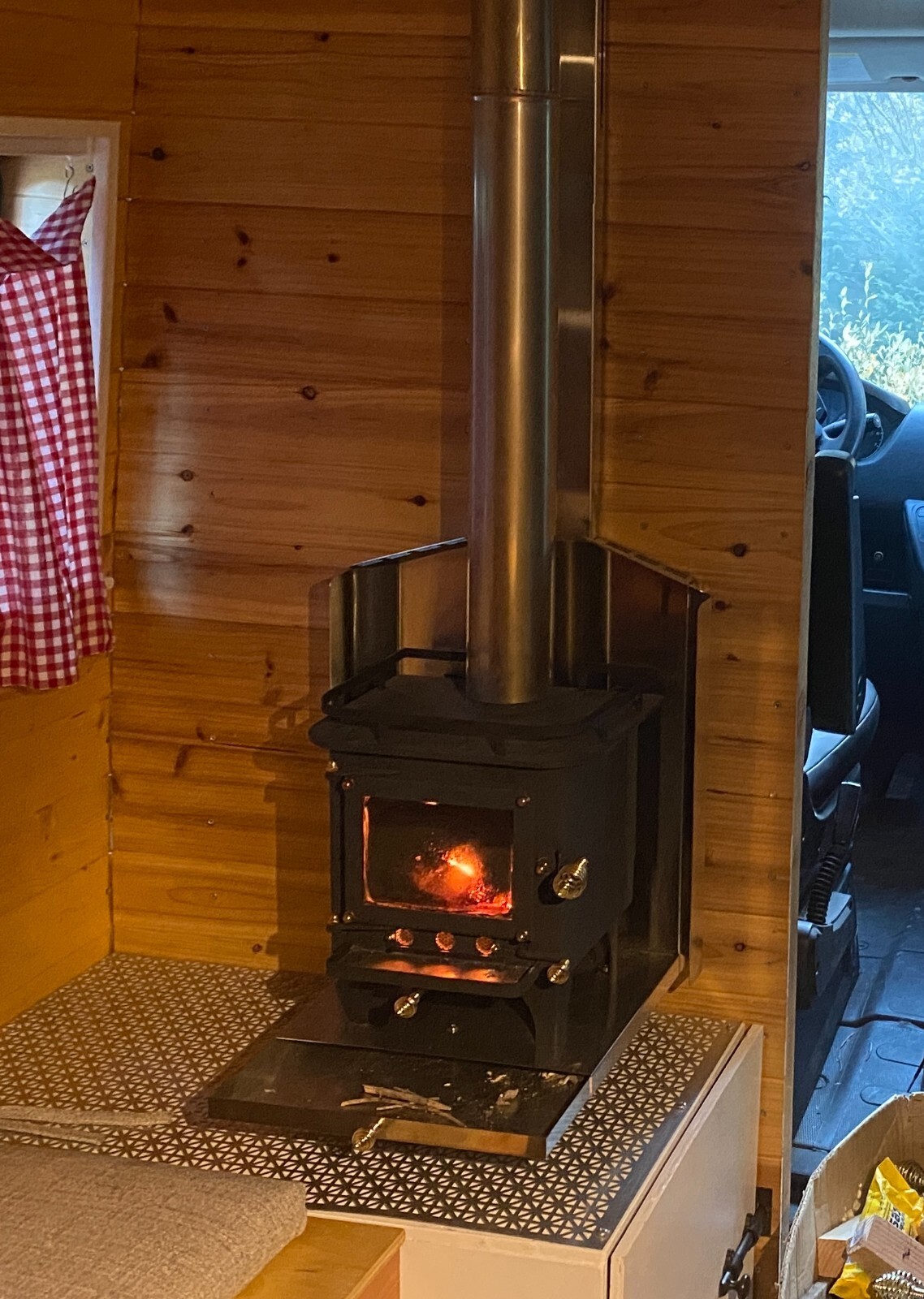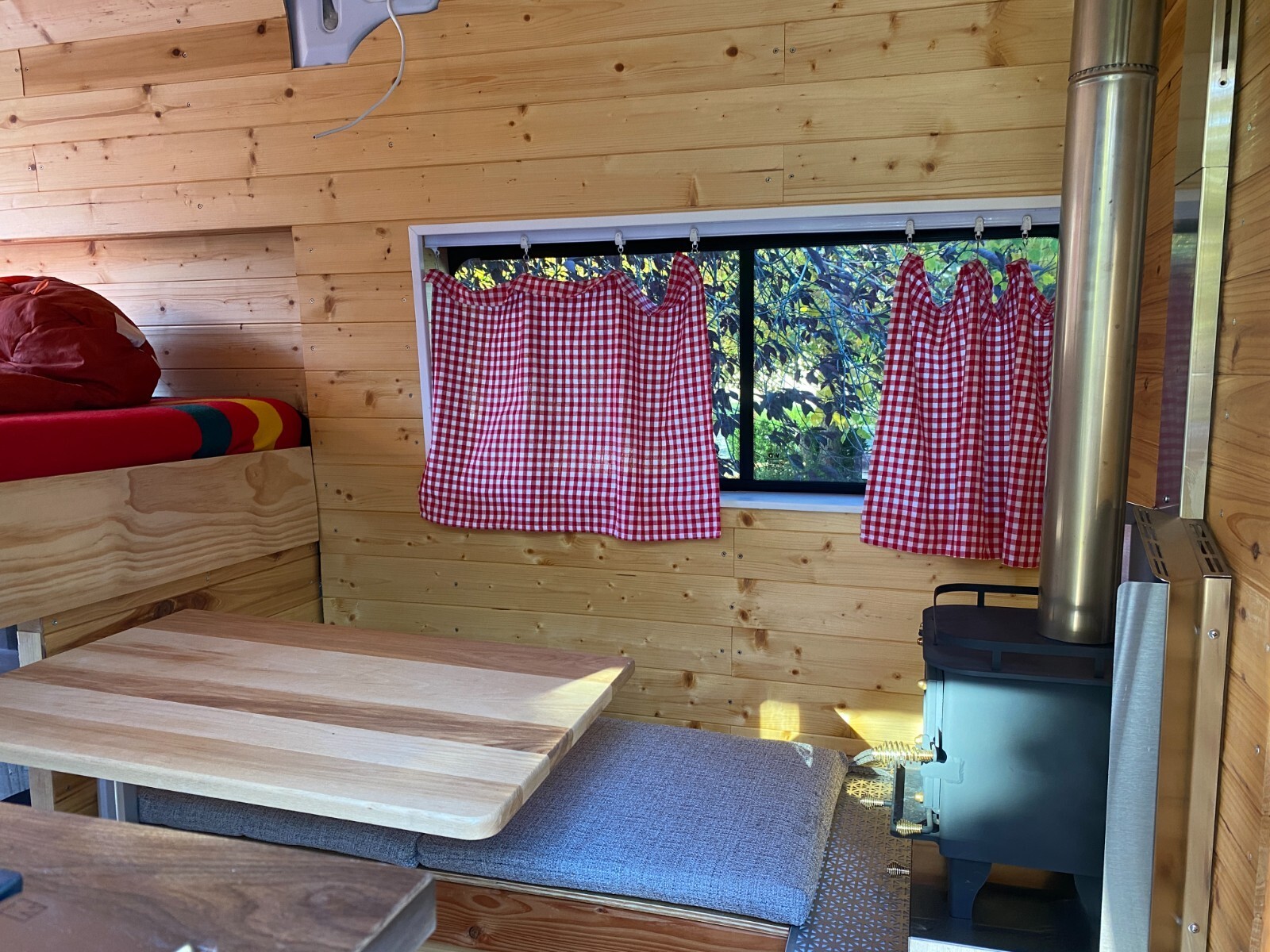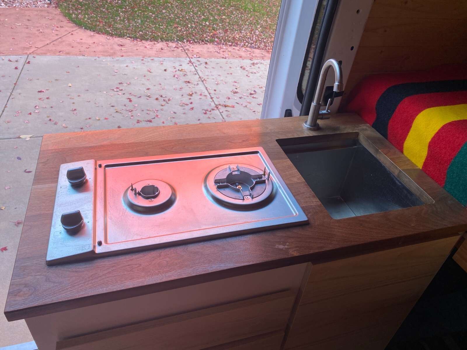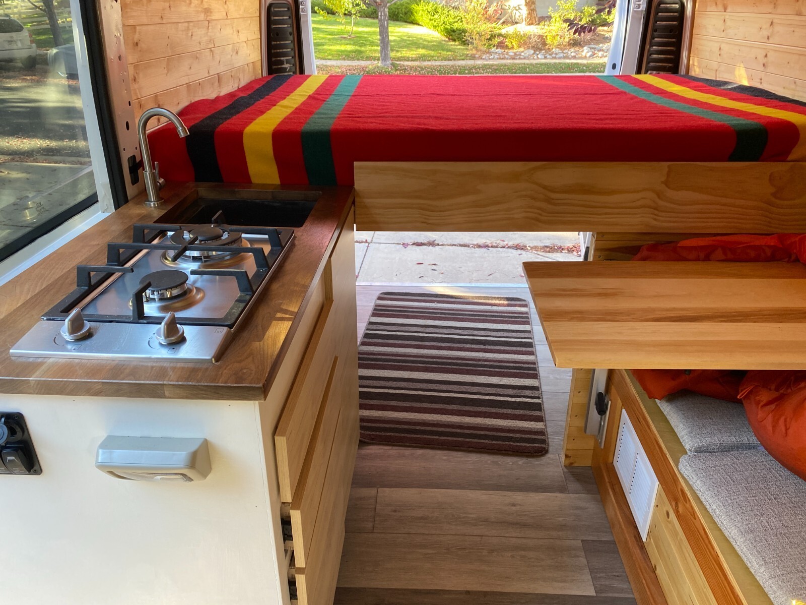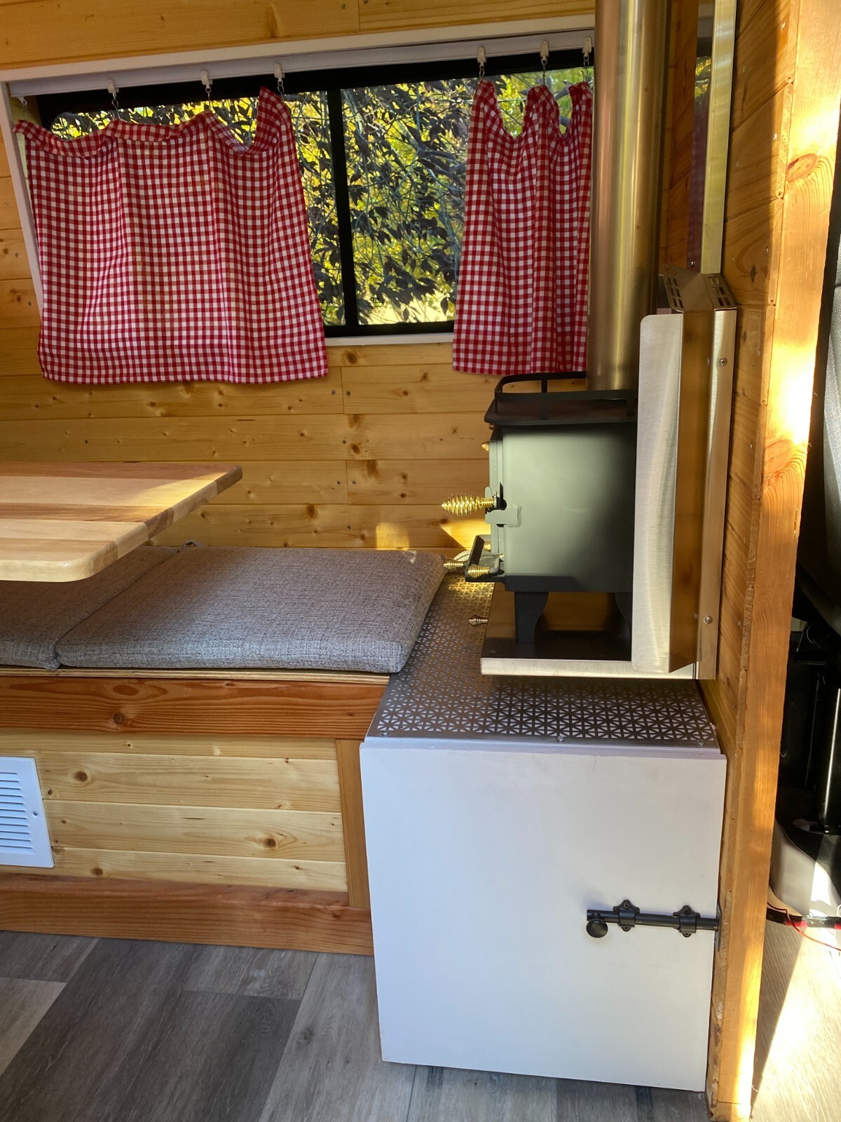 This is a DIY 2020 Ram Promaster 1500 (3.6L V6) camper van.I wanted a simple and reliable van to take me to the trailheads in Colorado.The bed is 73" x 53" (a little shy of a full).The kitchen galley is equipped with a two-burner gas stove and a sink. The water pump is located under the galley. A 5-gallon freshwater container and a 5-gallon grey water container are located under the sink.The refrigerator (28L) can be pulled out from under the wood stove. This stove (Cubic Mini) creates a pleasant and cozy atmosphere.The batteries (2 x 100 Ah Li batteries) are charged from the alternator. I did not install a solar panel but the extension cable is already attached to the charge controller. I never stayed more than two days at the same place, and the battery capacity was more than sufficient to power the refrigerator, the lights, the water pump and to charge my phone.