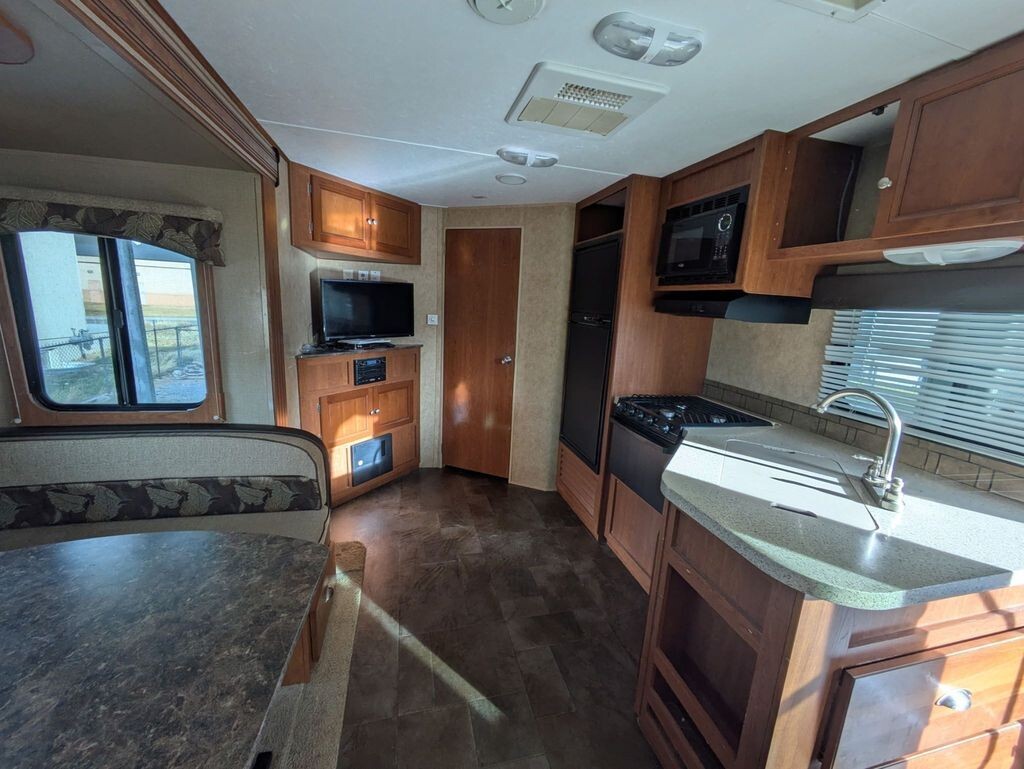 The kitchen is designed for convenience, offering ample storage and workspace for meal prep, along with all the essentials needed for weekend getaways or extended stays. The private sleeping area and well-appointed bathroom make this a fully self-contained RV thats comfortable for couples or small families.
