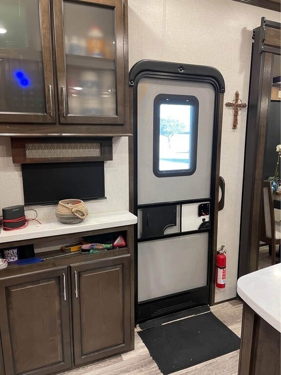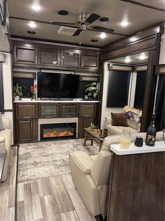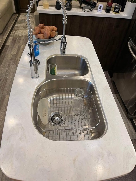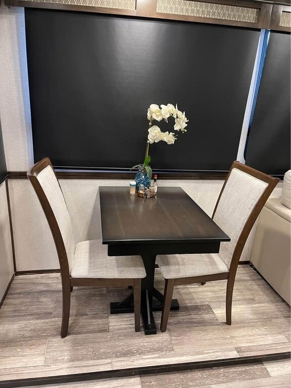“2021 Dutchmen Yukon 410RD fifth wheel, 42’ in length. One-owner unit that has been well cared for—non-smoker, no pets, and lived in full-time at a covered RV park. All original with residential-style appliances, and everything works as it should. There is a soft spot in the kitchen floor. Features include three A/C units, four slide-outs, Lippert auto-leveling system, two awnings, two TVs, and two fireplaces. Very clean and ready for its next owner.”