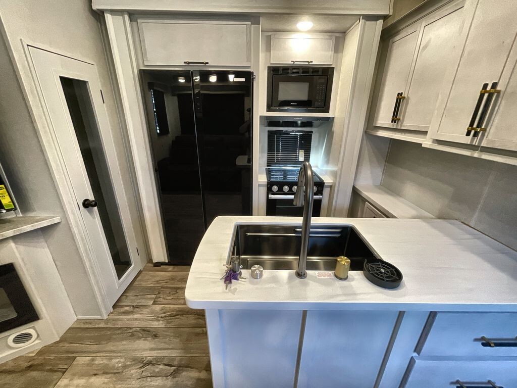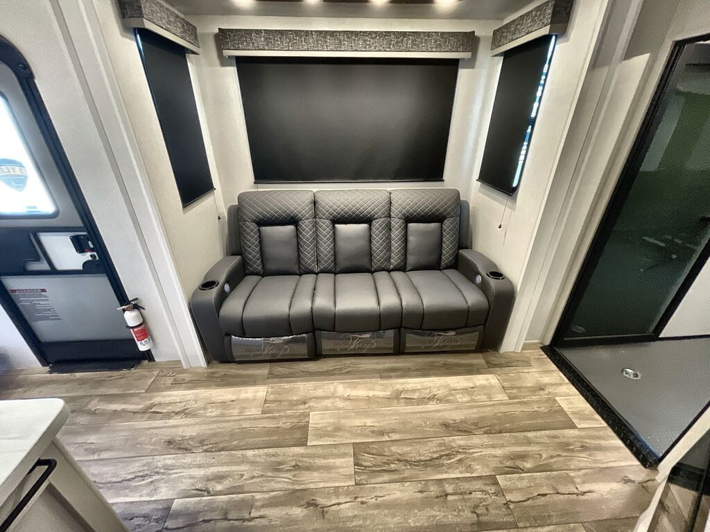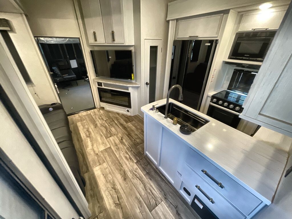 Inside, the 3600 features a thoughtfully designed interior with vinyl flooring throughout, providing a practical and easy-to-clean surface. The central living area includes theater seating within a slide-out, enhancing the available floor space and offering a comfortable spot to relax. An entertainment center with a 40-inch fireplace adds warmth and ambiance to the space.