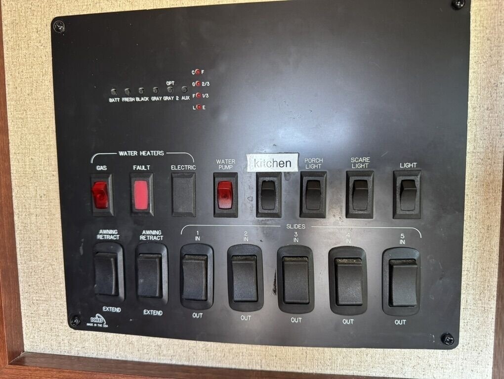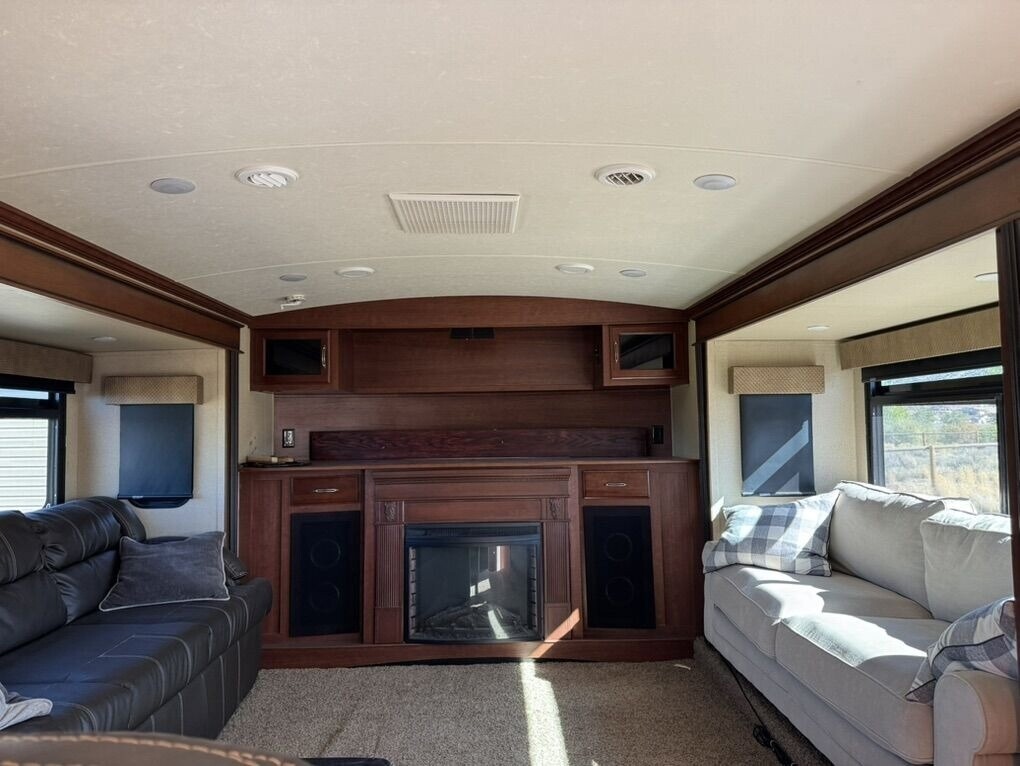 The 379FL features a large front living area with opposing slide-outs, fireplace, and entertainment center. Originally it came with two sleeper sofas — we removed one and replaced it with a standard sofa for added comfort and space. It also originally had double recliners; those were replaced with a single recliner to open up the room.