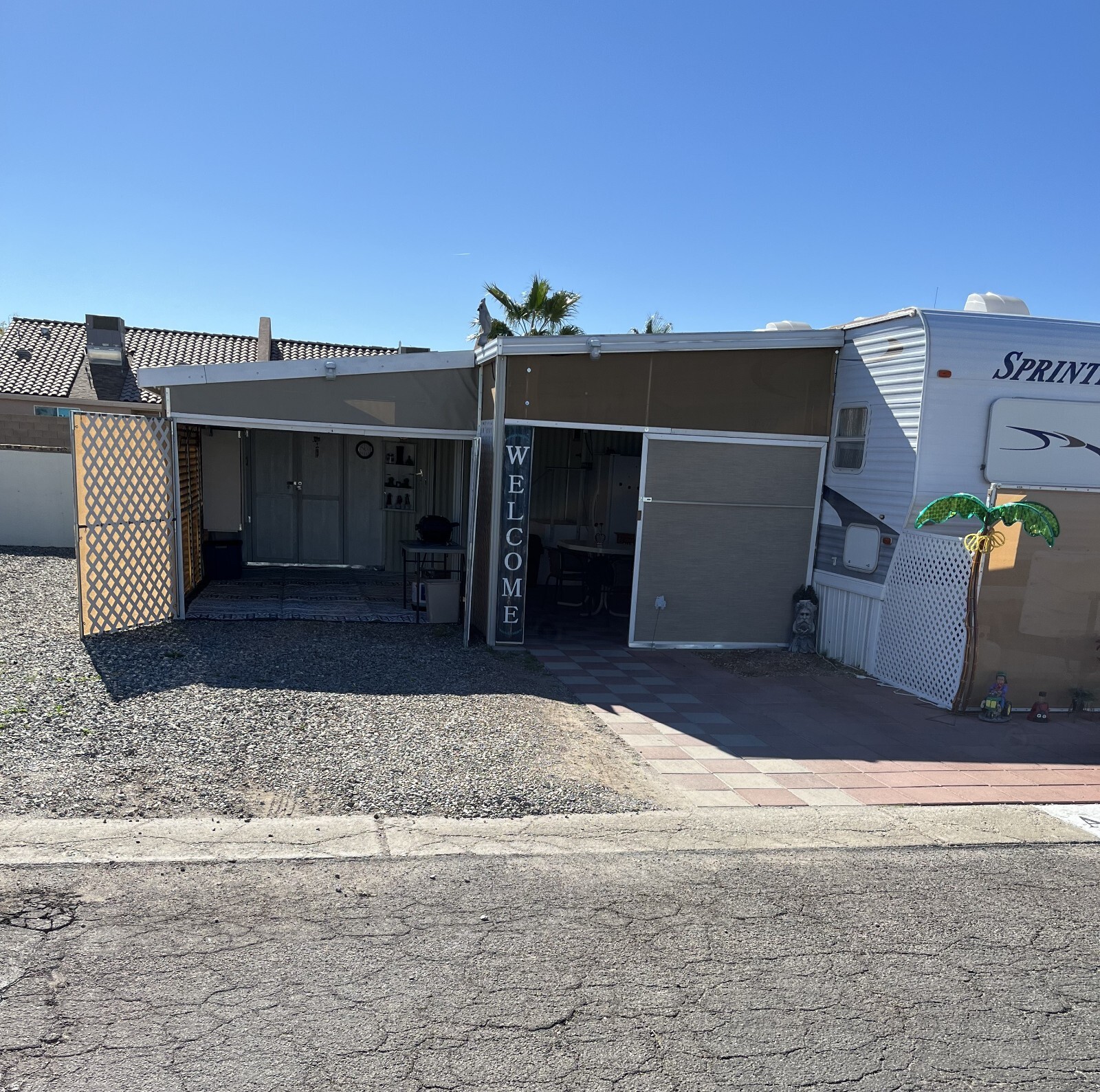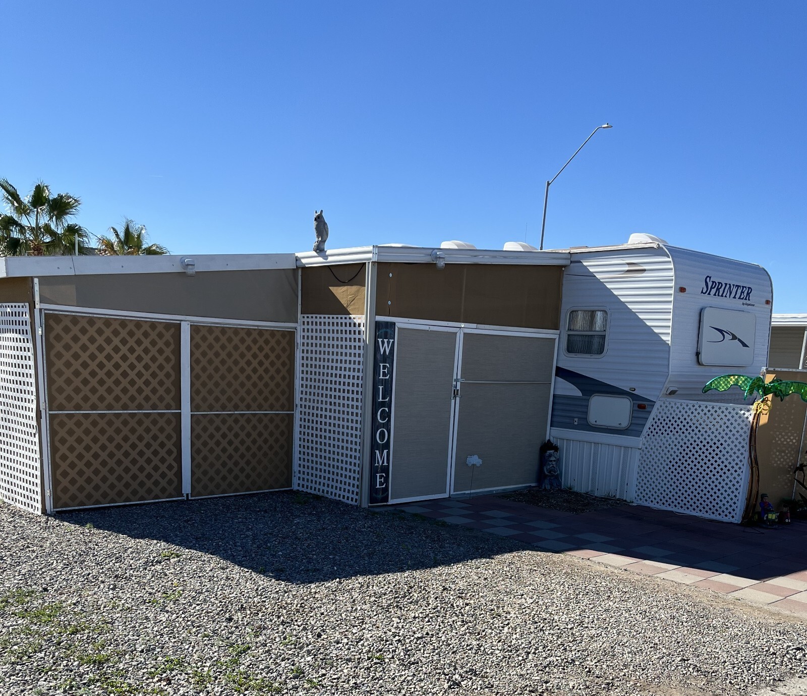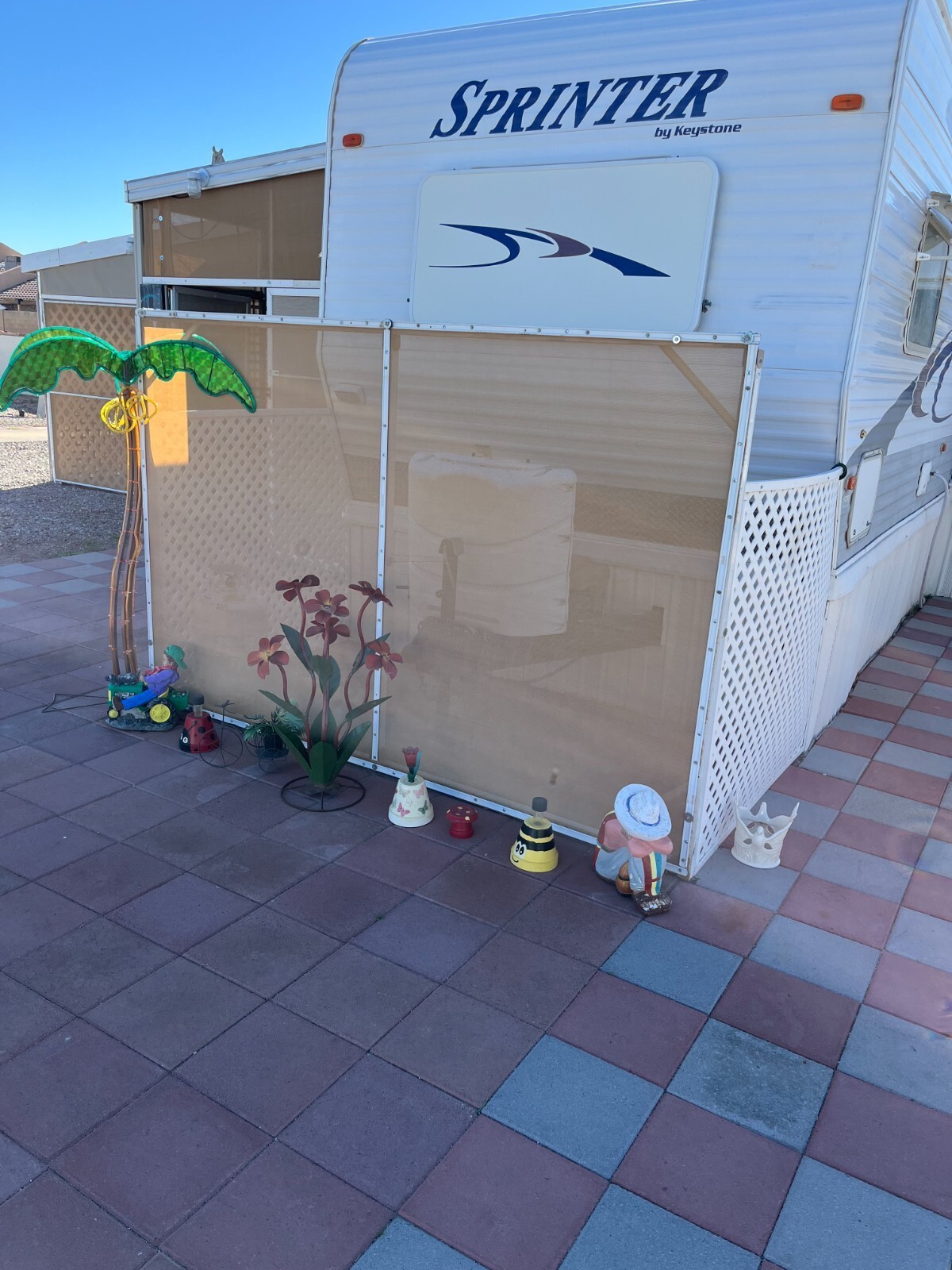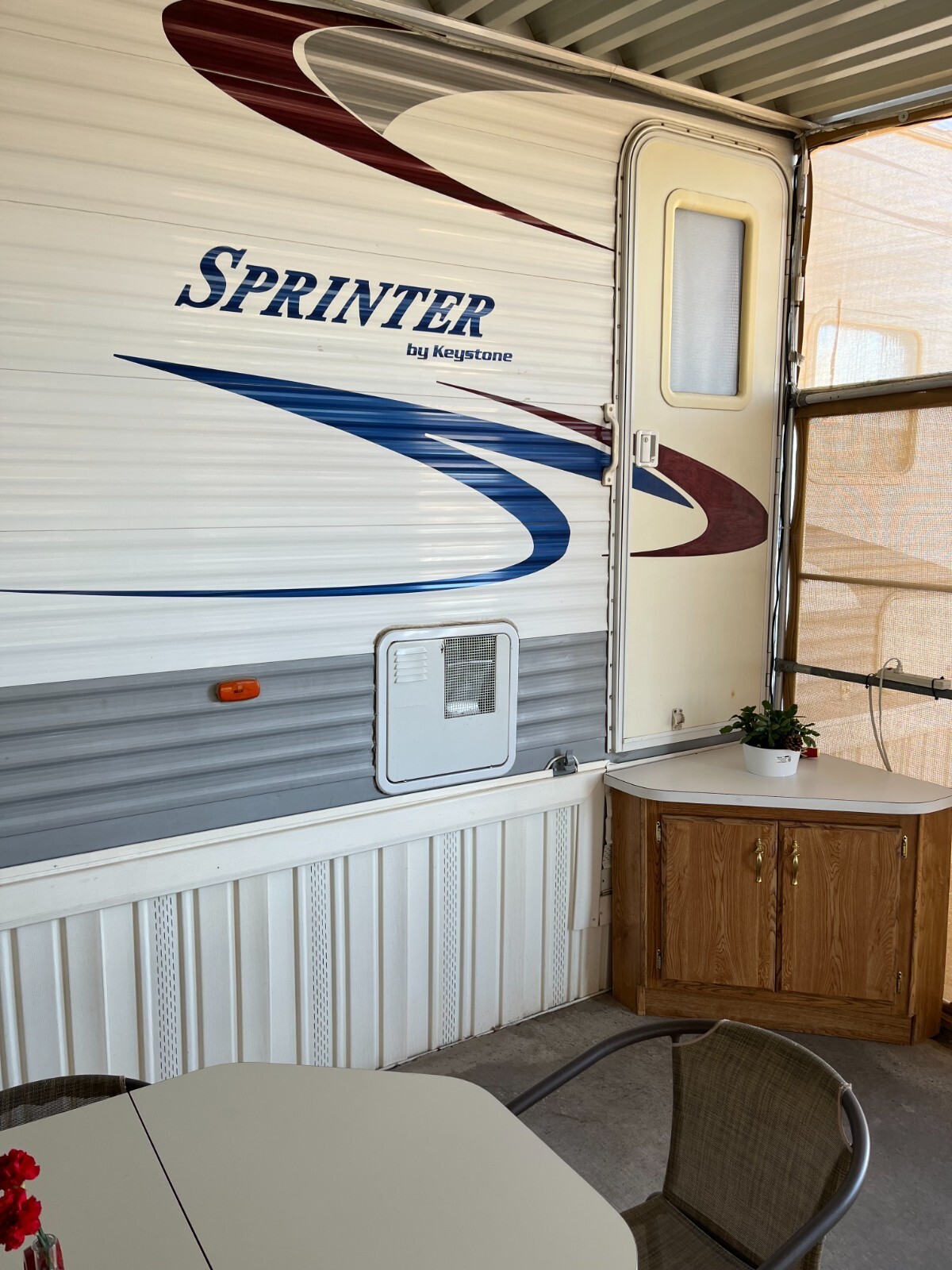 What is offered here is a 2004 Fleetwood Sprinter 30 foot travel trailer that has been permanently set up in an Age 55 + RV Resort in Yuma, Arizona, the trailer was bought new here in Yuma and has never been used for travel, we are the fourth owners. The park that it is set up in is Encore Cactus Gardens, Yuma, Arizona, the site location of this unit is A29. Encore Cactus Gardens has a website on the internet, if you want to find out information on it. This trailer is situated nearly directly across the street from the main office, swimming pool and hot tub, recreation hall and kitchen so easy access to all activities offered of which there are many, there is also a pool room, library and laundromat in a separate location about 2 streets over. Also full adjoining access to the facilities and activities to the sister park which is Encore Desert Paradise, Yuma, Arizona, also found on a separate websitefor information on that park. There is a small 110 volt Costway washer and dryer in this trailer as noticed on the pictures that works well, also in the room that has been built on is a 8 foot his and hers closet which makes up for the lack of space for clothes in the bedroom area of the trailer, also extra storage cabinets. The screen room area of the trailer is 363 sq ft, excellent area for entertaining and the double doors at the front can be opened up for parking or working on a car or golf cart or storage during the times you are not here, the screen room screens stay up for the year and never have to be taken down or apart, also inside the screen area is an 8 ft x 8 ft storage shed accessible from the door of the trailer and a huge 25.2 cubic fridge / freezer, the fridge is 15.2 cubic and the freezer 9.8 cubic, inside the trailer main room is a folding couch that makes into a bed, the single bedroom is 8 ft x 8 ft and has a queen size bed, all appliances, including water heater, furnace and air conditioner are in good working order, most everything that you will need and maybe things you won't even needwill be included in the final price, cutlery, kitchenware, bedding, all furniture, tv, microwave, etc, etc, ......., the power for the trailer is equipped with 50 amp and also 30 amp breaker, the annual site fee of $3768.00 has been paid for and not due until October 1, 2026, for anyone that may consider moving the trailer out of the park it would be a lot of work, but lots of time to do it, to anyone that may have questions 'please ask' or would be wanting to look or have someone look at our place please make prior arrangements to do so, we would like a possession date of March 13, 2026. Like most rv parks Cactus Gardens has a policy of a buyer to do a background security check, it's a 2 step system, first step is an in depth application of $50.00 for U.S. citizens and $75.00 for non U.S. citizens, the form can be emailed to you or filled out at the Cactus Gardens office, usually takes anywhere from 24 to 72 hours to process and the total cost is $150.00, you can phone the office at (928) 342-9188 for any other questions on that if my explanation is too vague.