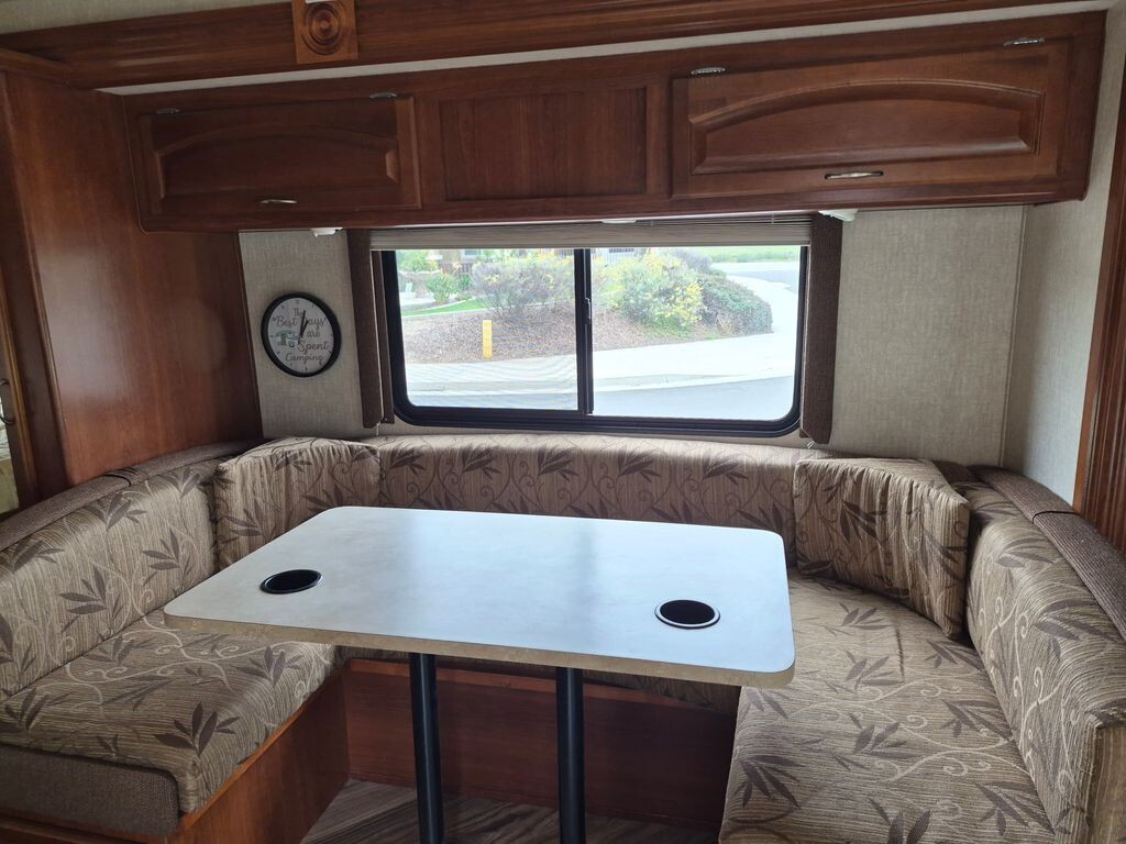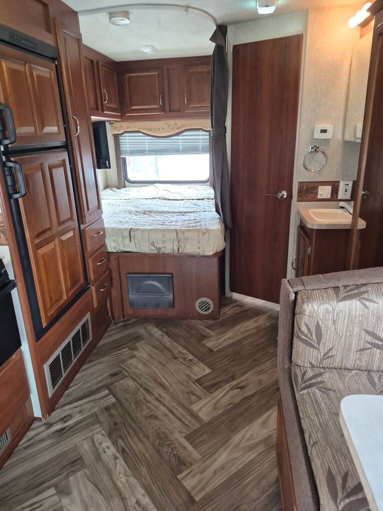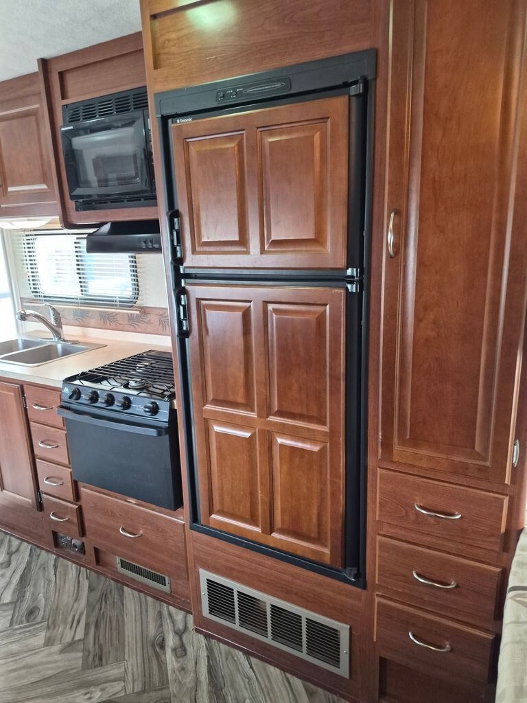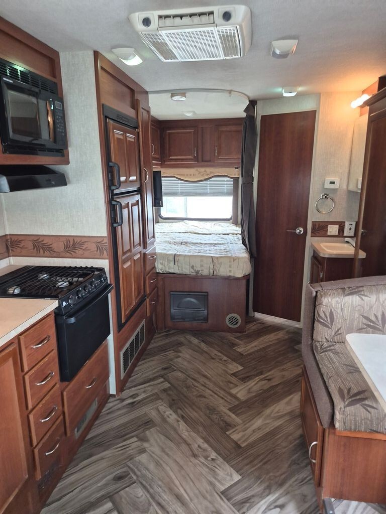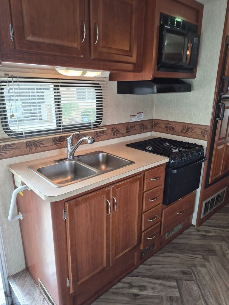 The fully equipped kitchen includes a 4-burner propane stove with oven, microwave, ample cabinetry, and generous counter spaceperfect for preparing meals on the road. The private bathroom offers a shower, toilet, and sink, providing all the comforts of home.