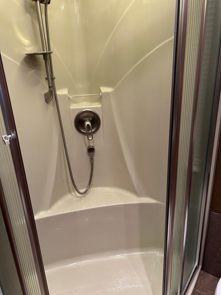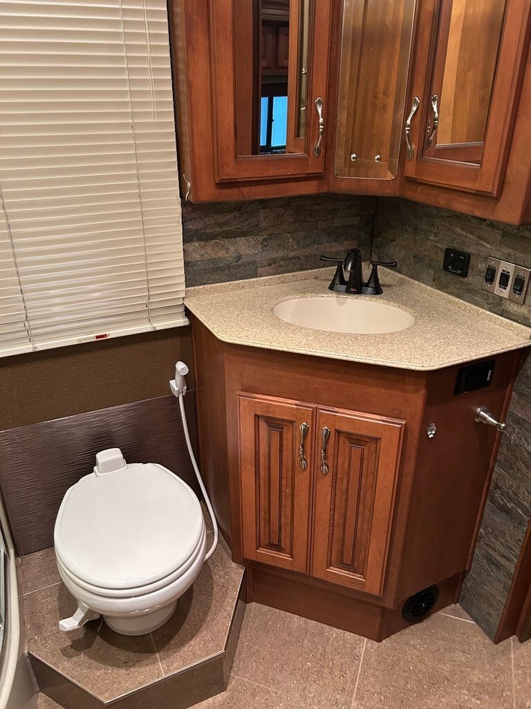 This coach features a bathroom complete with shower, toilet, and a sink with a medicine cabinet above for your convenience.