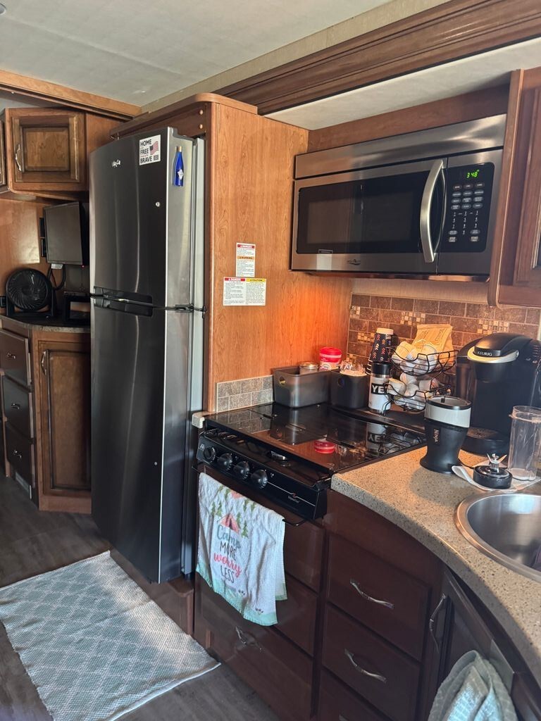 Residential Kitchen: Includes Corian countertops, a stovetop, a convection microwave, and a large residential fridge/freezer with an ice maker.