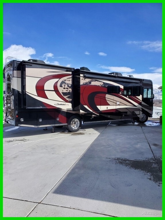 This Southwind is powered by a 6.8L V10 engine and a 6-speed automatic transmission with 20,000 miles. The overall length is 36.25 feet, and it comes equipped with 4 power-retractable slide-outs, a 15-foot power awning, 2 A/C units, a washer/dryer, an exterior entertainment system, and room to sleep up to 8. This unit has been well-maintained.