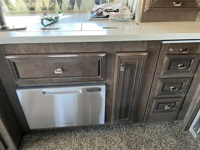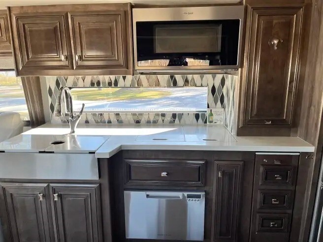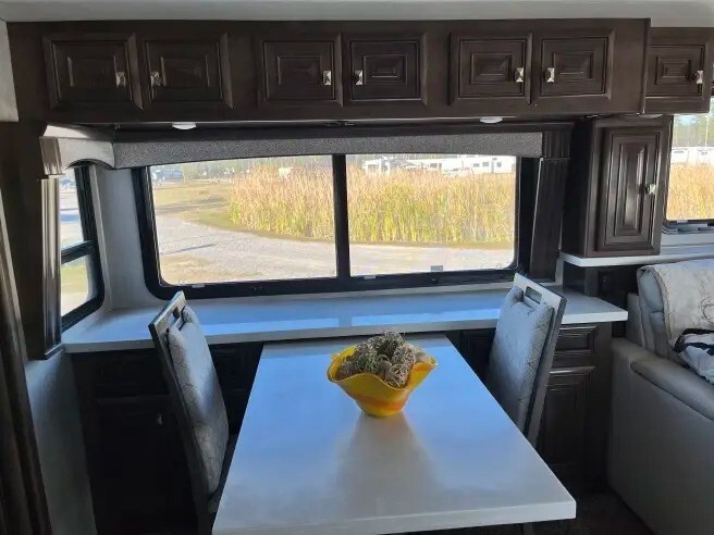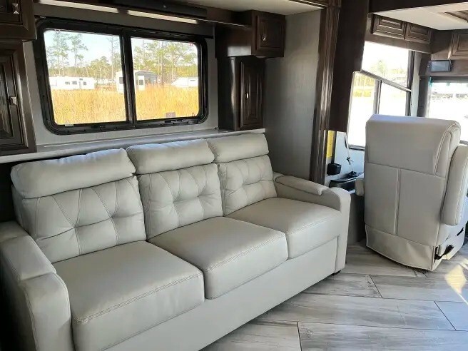The interior of the 44H is designed to impress — with tile flooring, solid wood cabinetry, leather furniture, and modern lighting throughout. The spacious front living area offers two leather sofas, a U-shaped dinette, and dual opposing slides that create a true residential feel.
